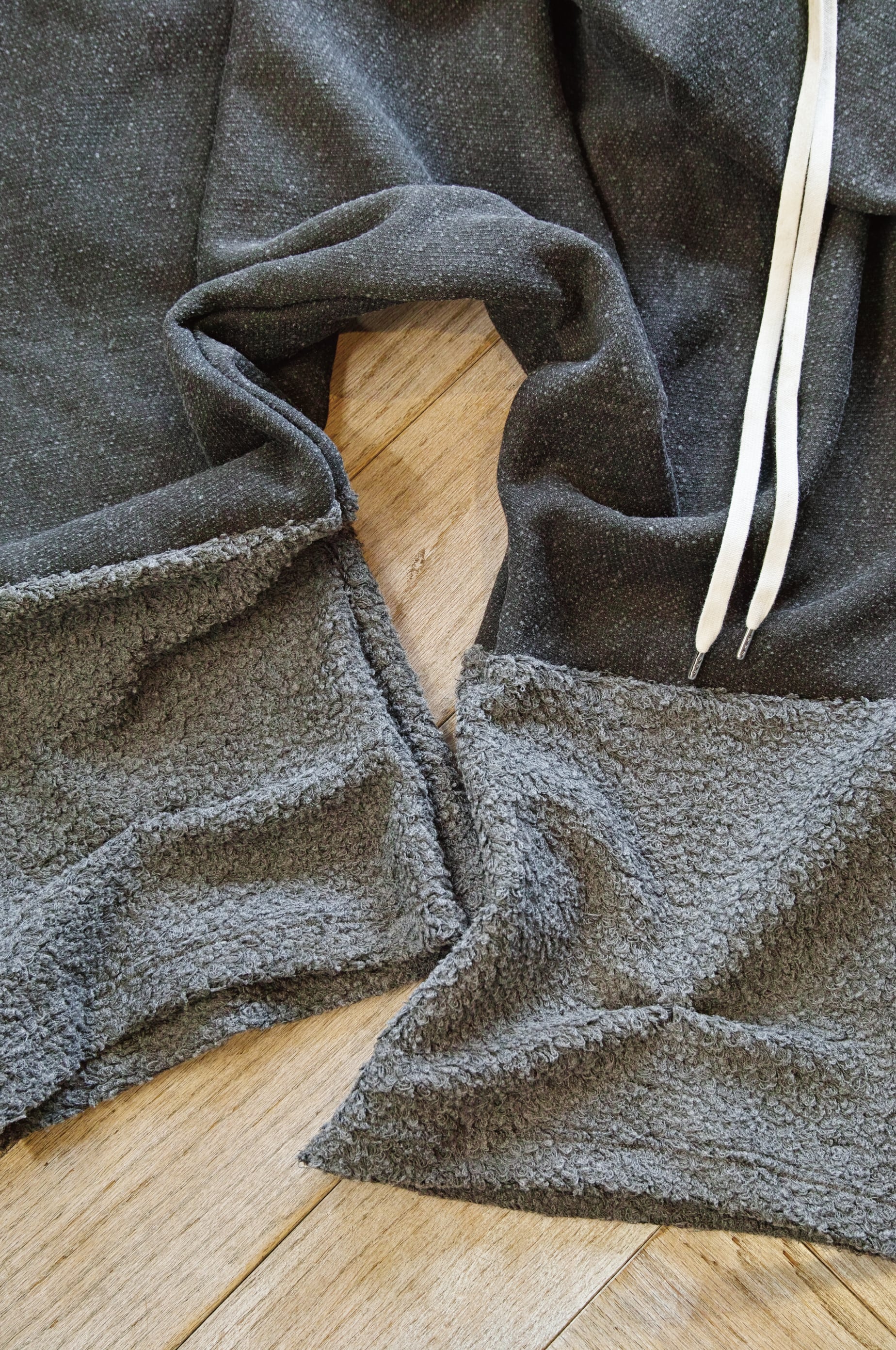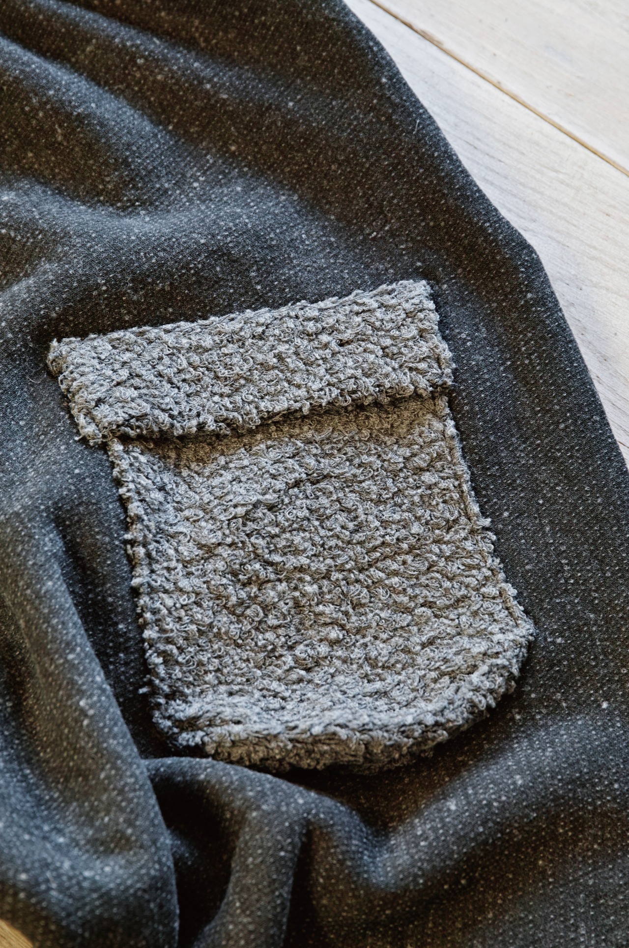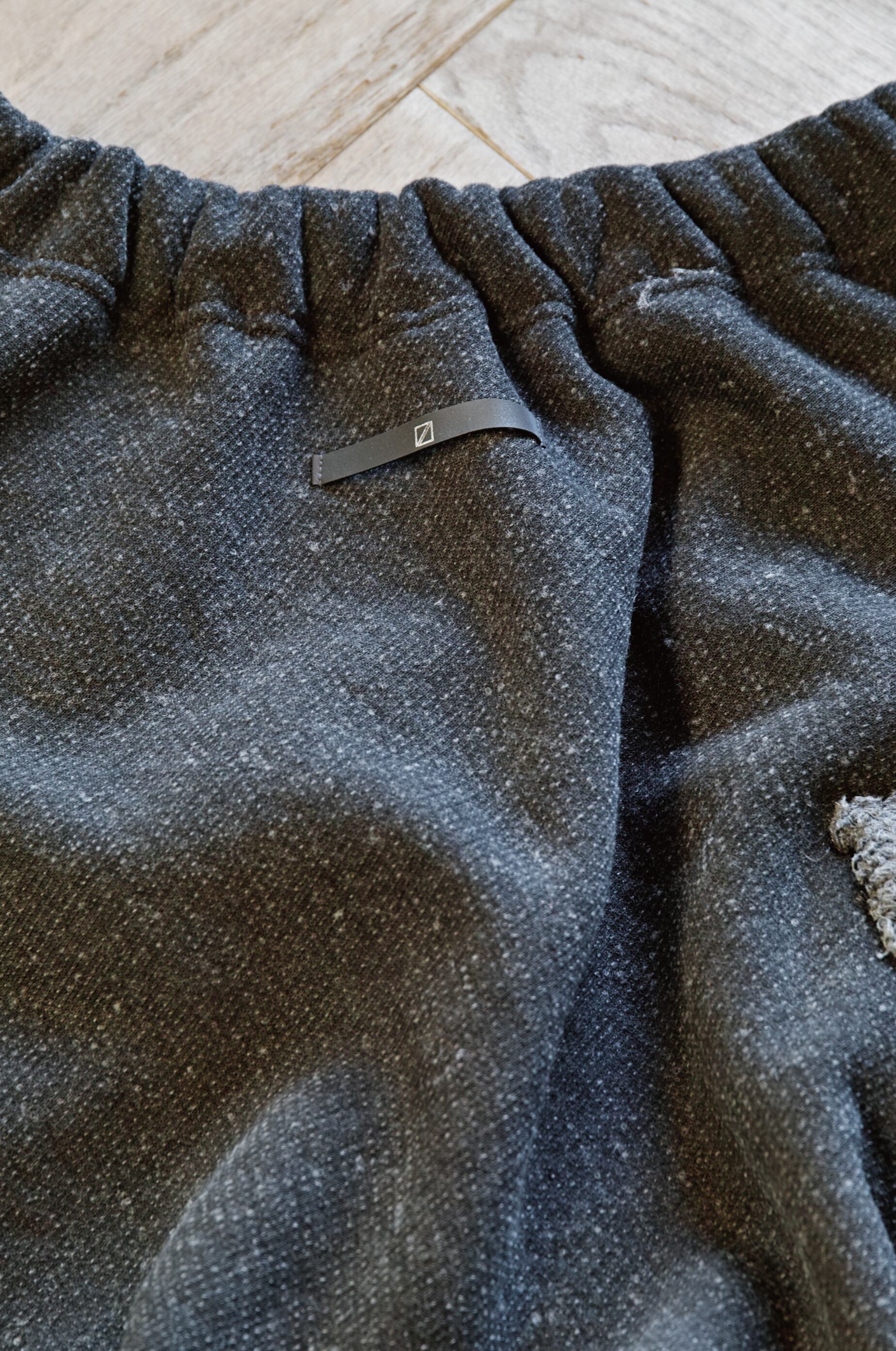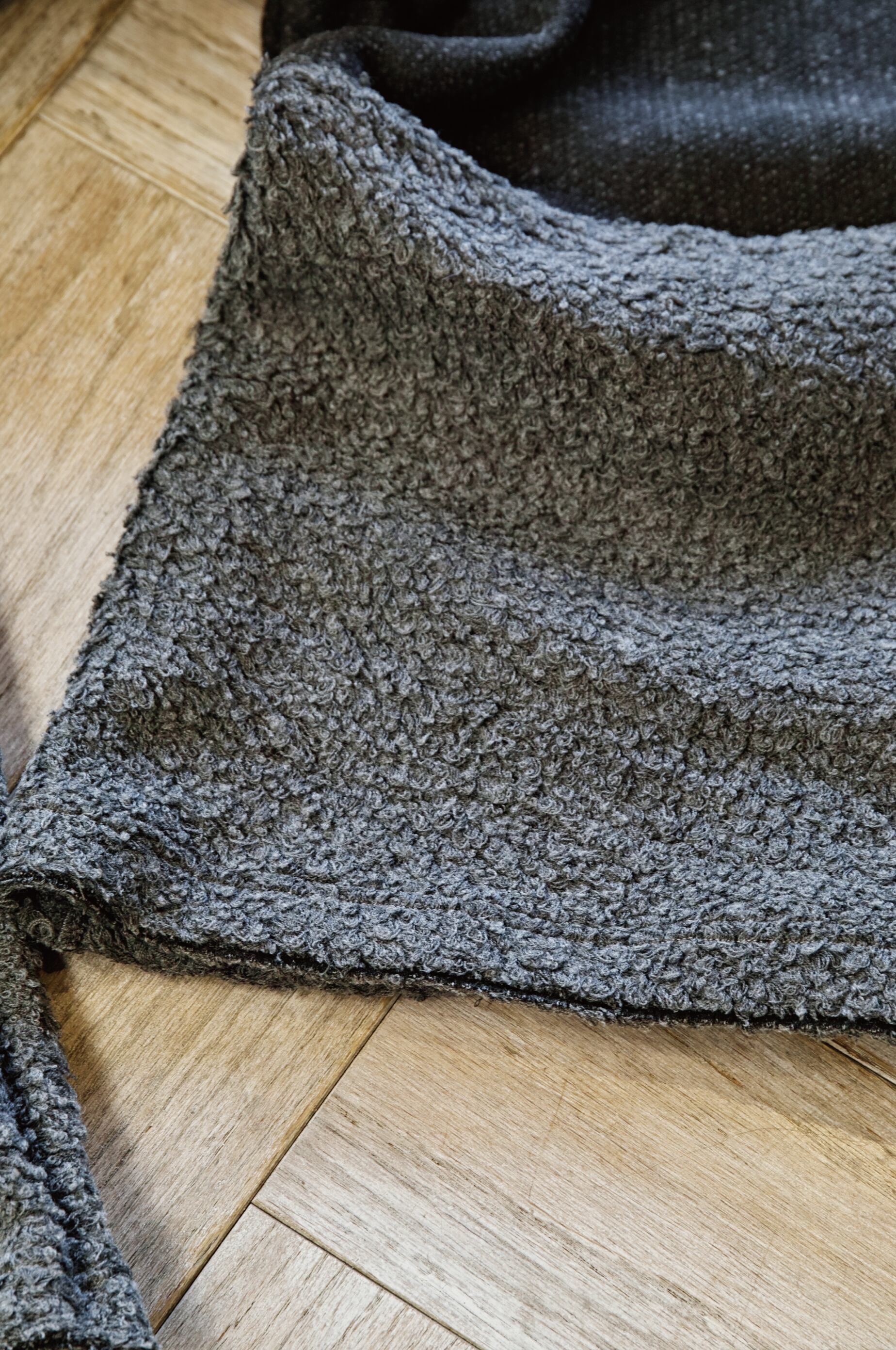 Ⅰ. 表が40/2コットン糸の引き揃え、裏には2/48ウールをループ状に編んだパイルジャージー。墨染めすることにより目が詰まり、重厚で堅固な風合いと質感に。パイルジャージーのダイナミックなドレープ性。