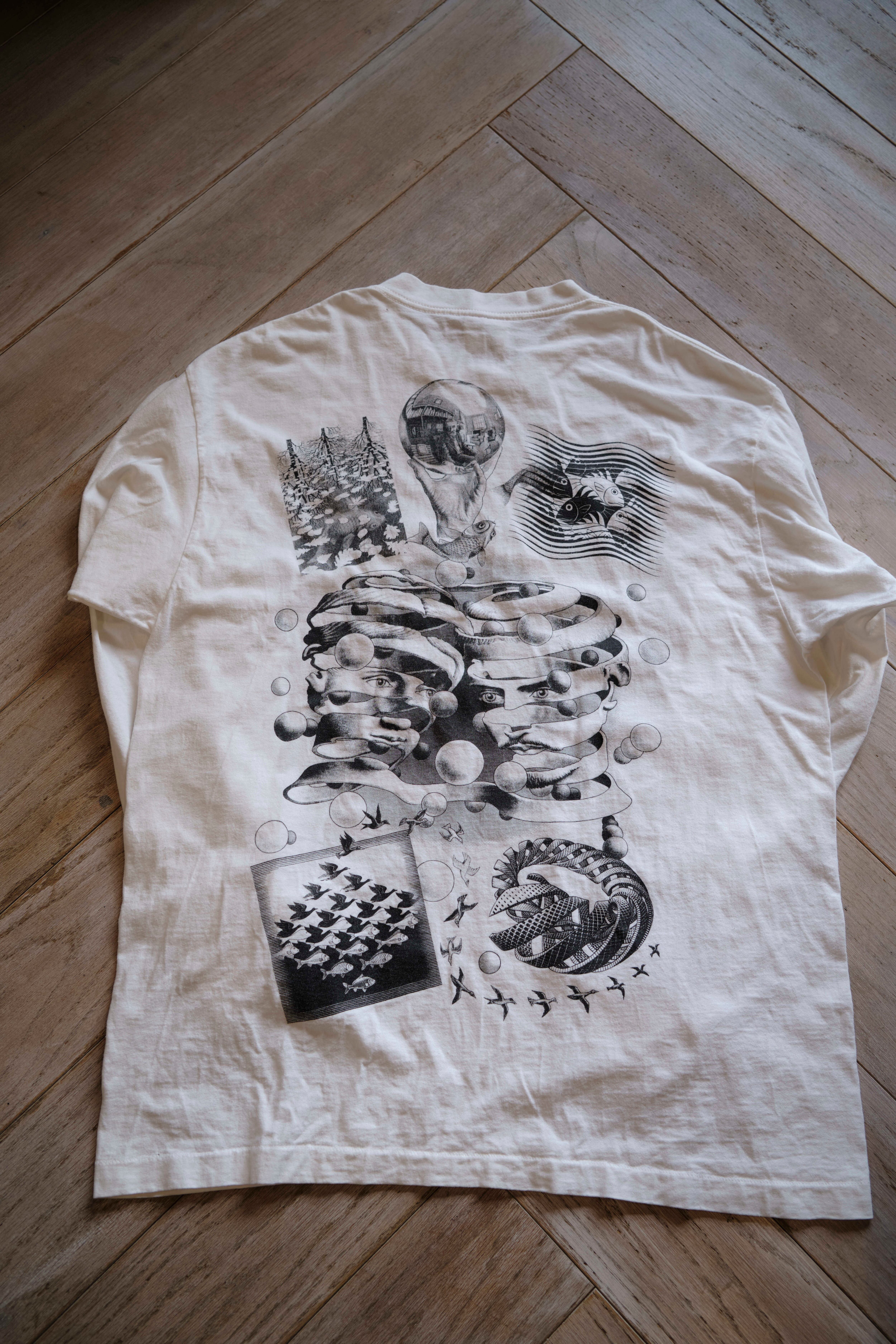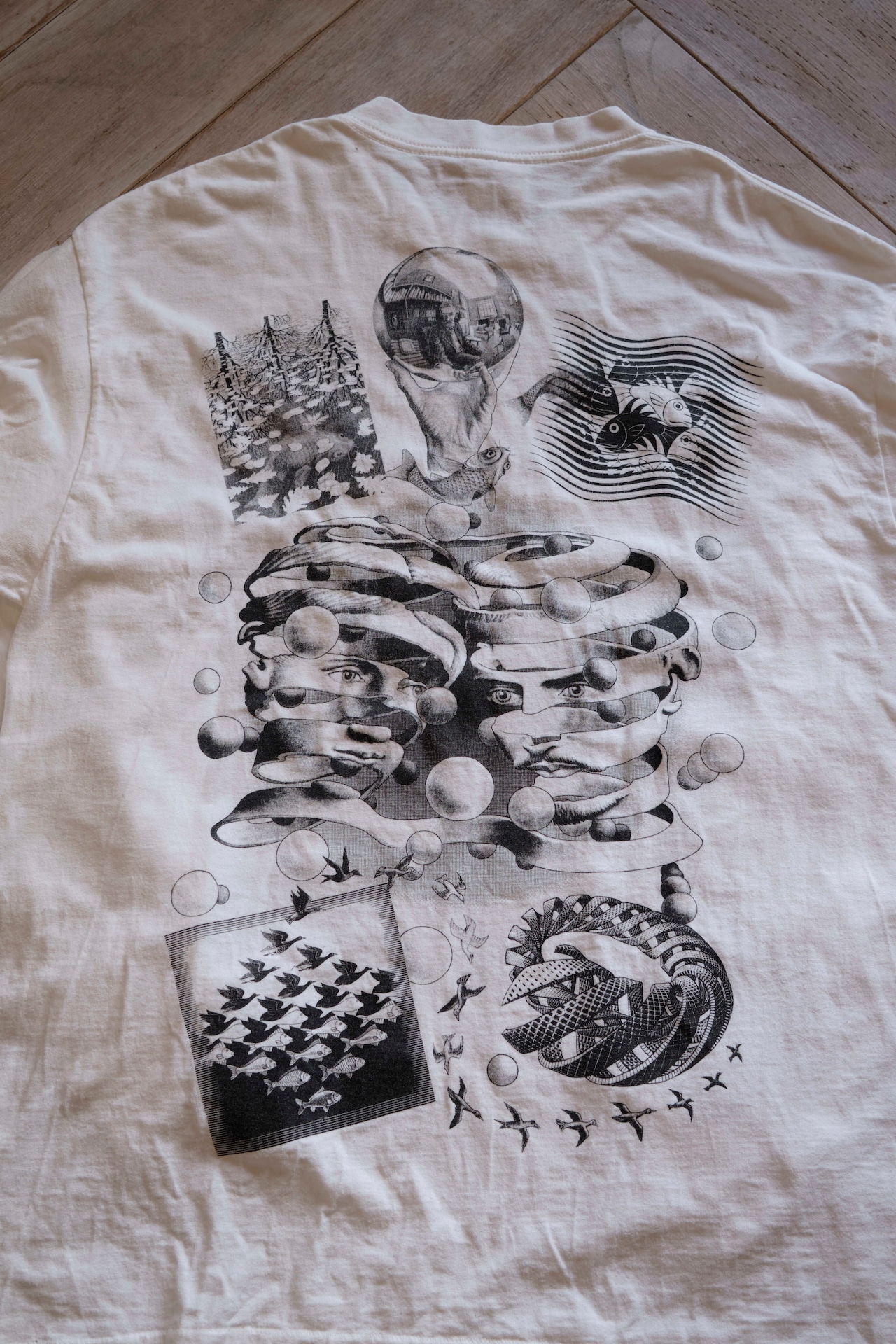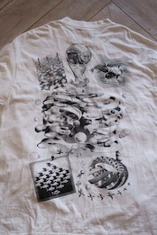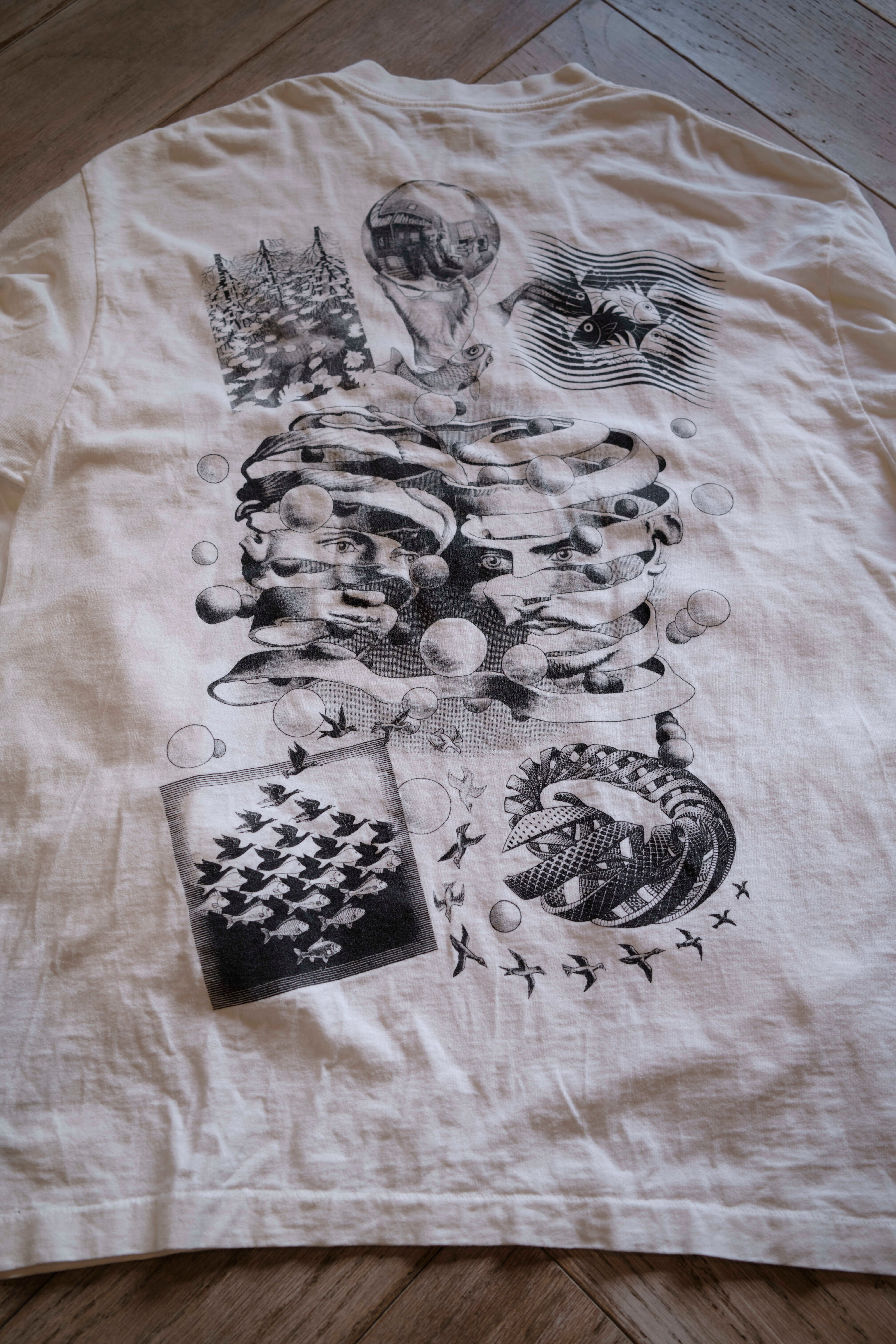 Ⅲ. エッシャーの代表的な作品群を身頃から袖まで隙間なくコラージュし、プリントした秀逸なデザイン。エッシャーらしい狂気的な世界観を1枚に凝縮したスペシャルな逸品。