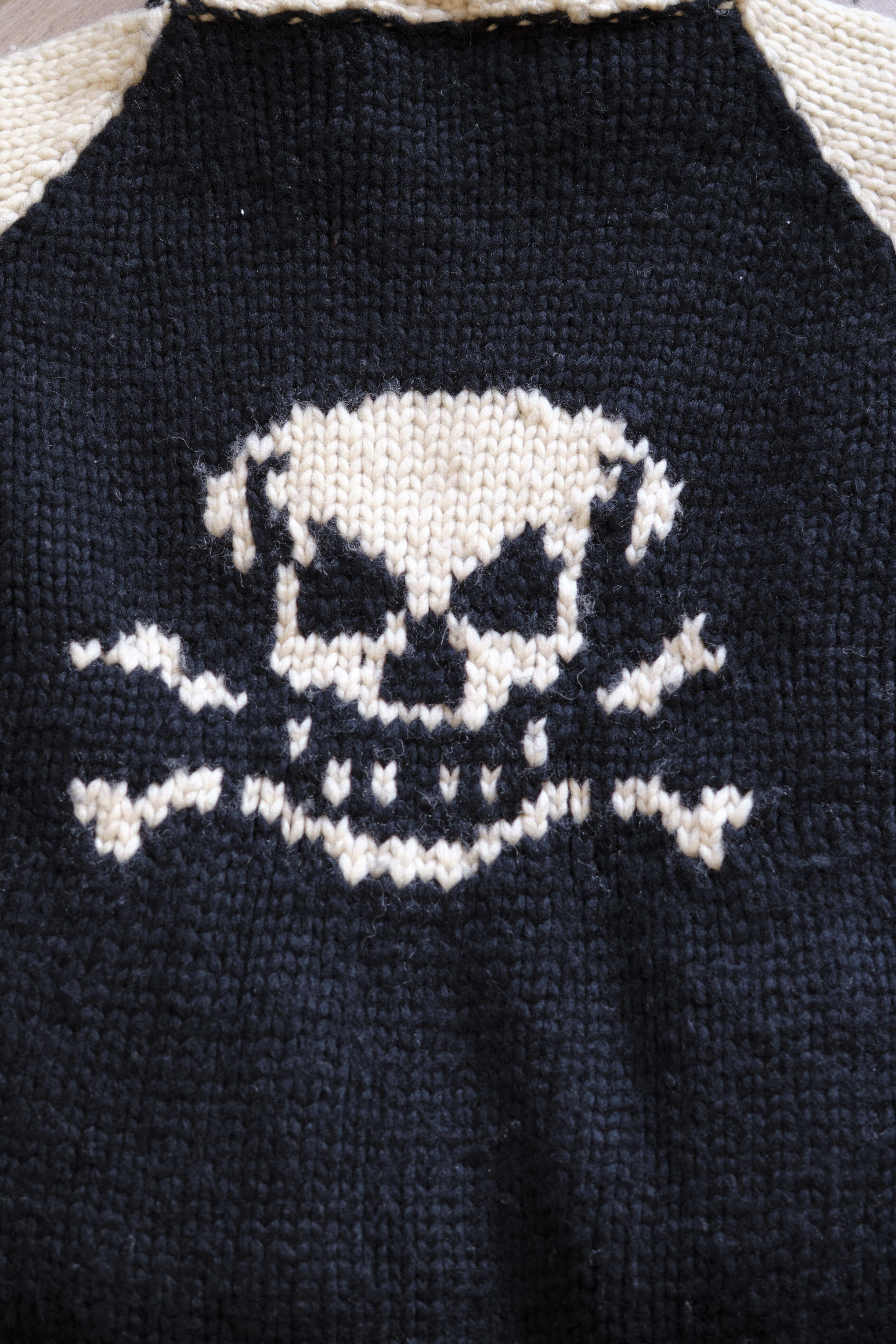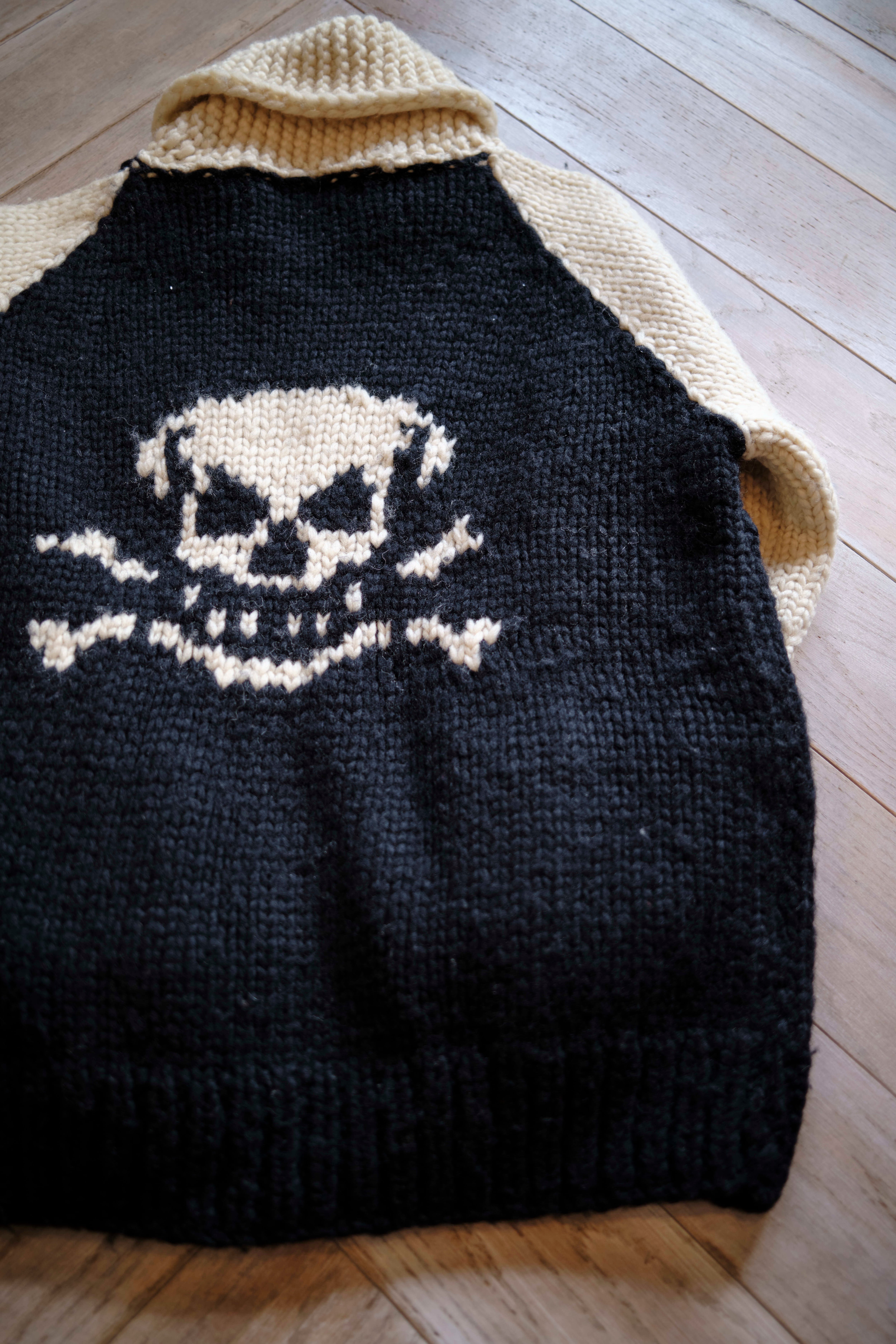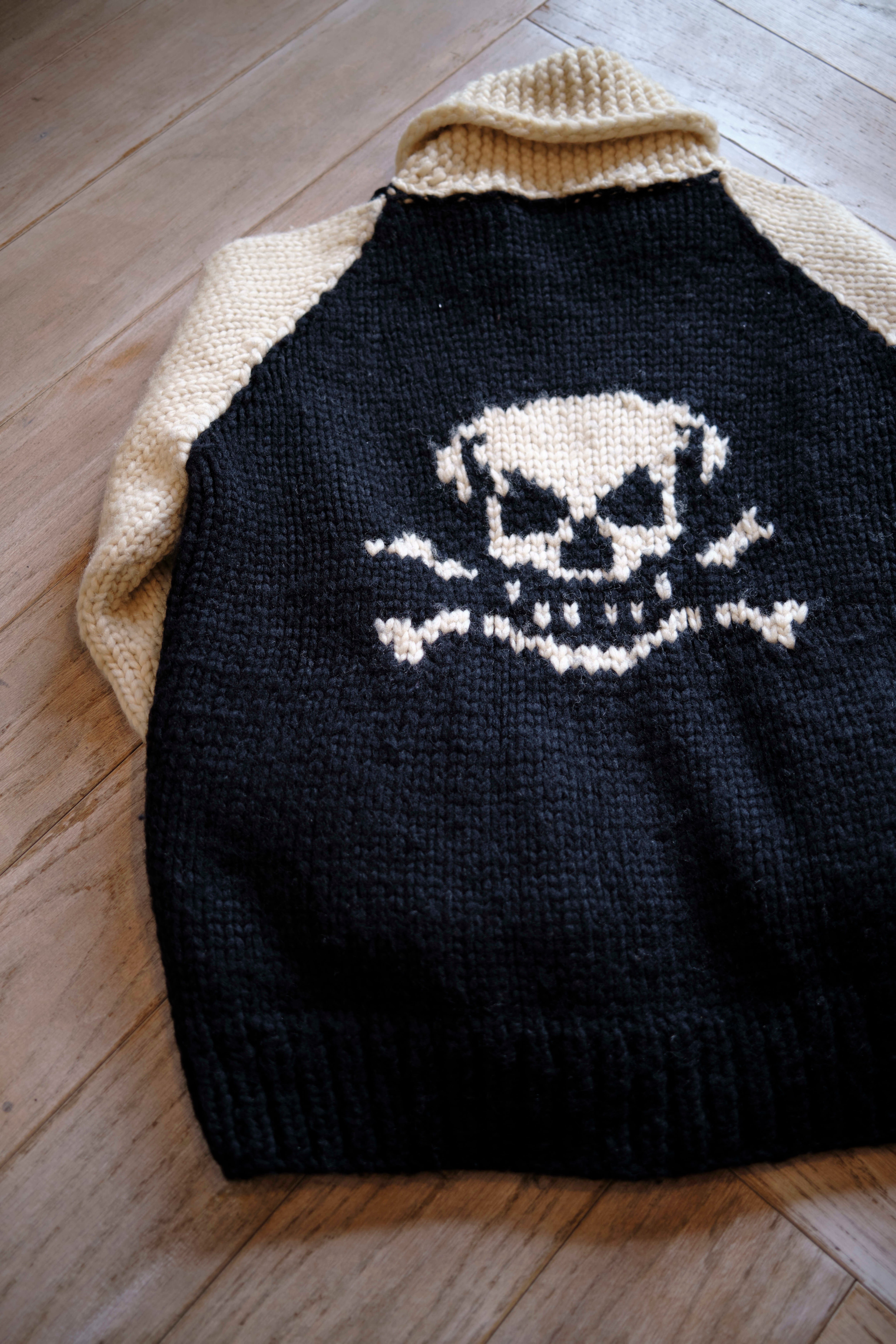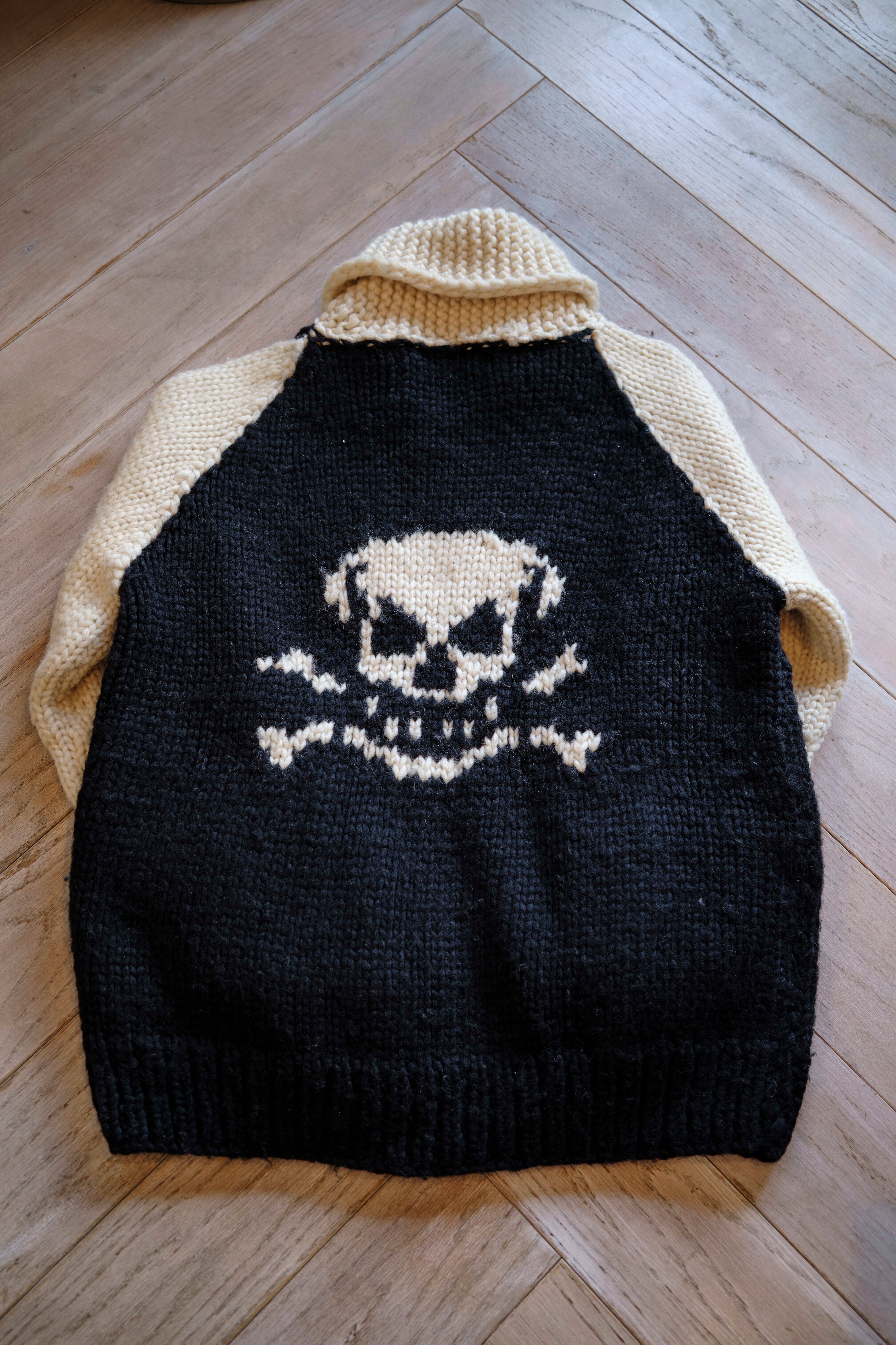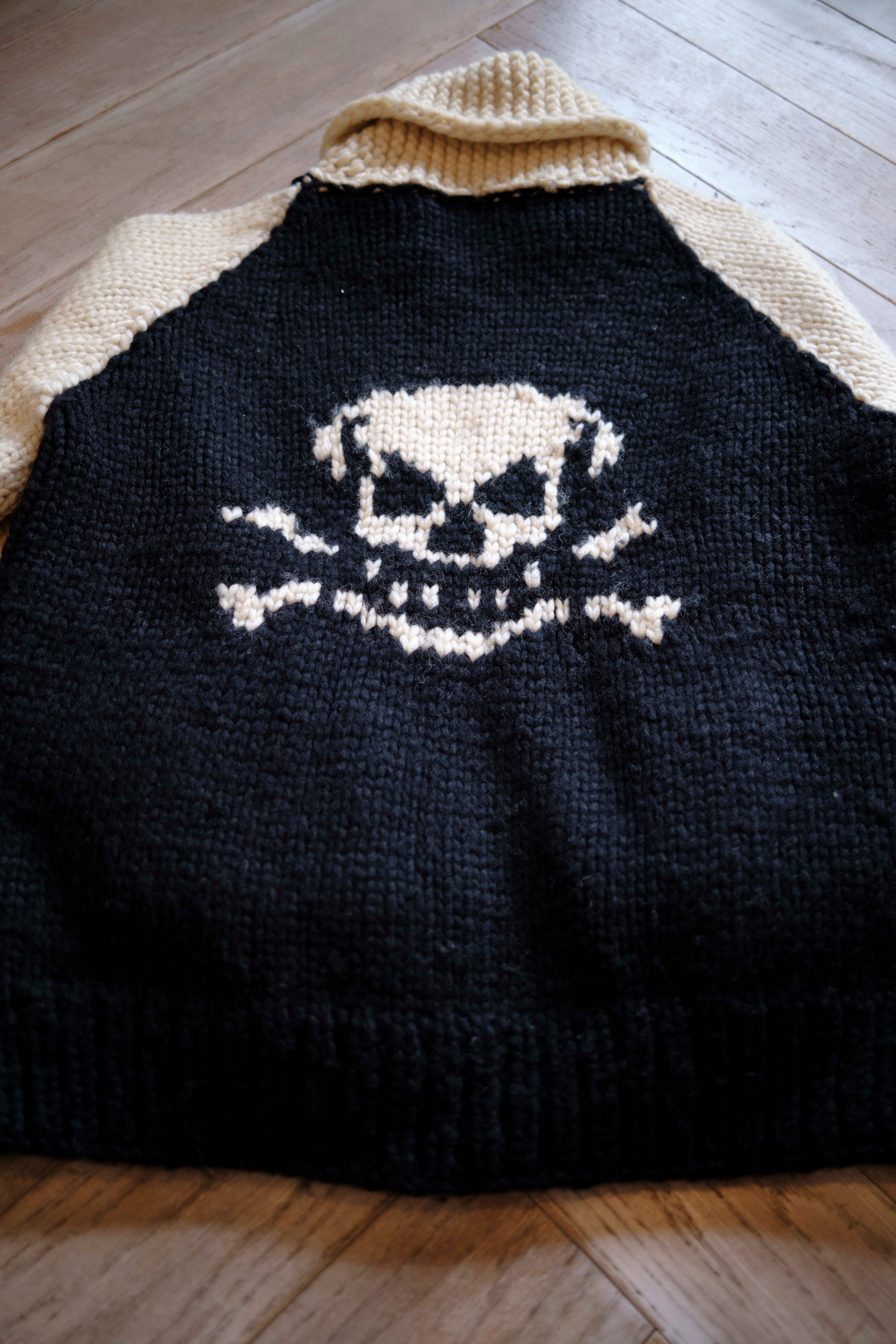 Ⅲ. 前後に大ぶりのスカル柄を配し、袖は2本ラインの配色切り替えで構成。シンプルな図案ながら、1枚羽織るだけでコーディネートの主役になる存在感。