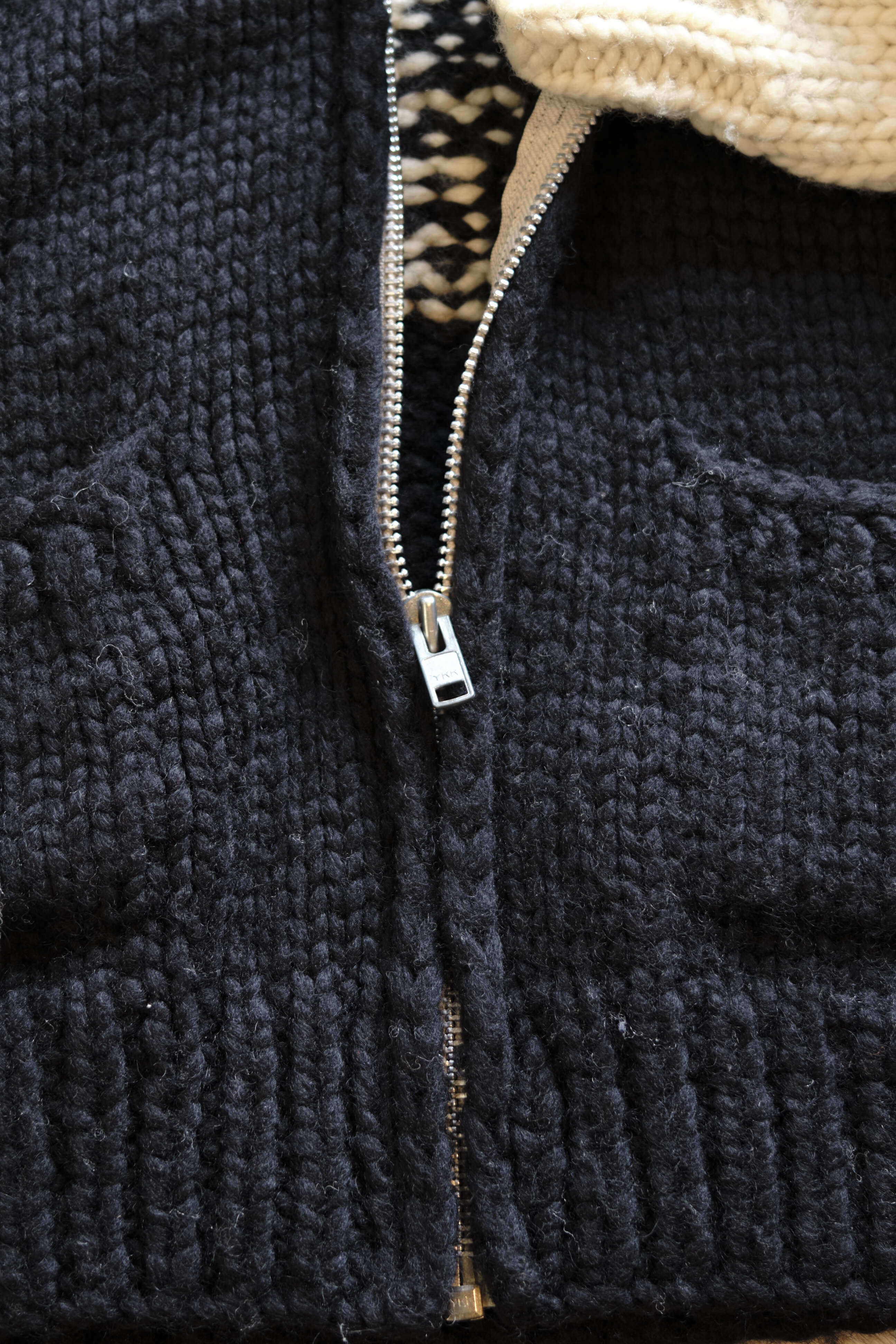 Ⅱ. フロントは着脱しやすいフルジップ仕様。カウチンらしい無骨さを残しつつ、ジップアップブルゾン感覚でモードからストリートまで幅広く合わせられるデザイン。
