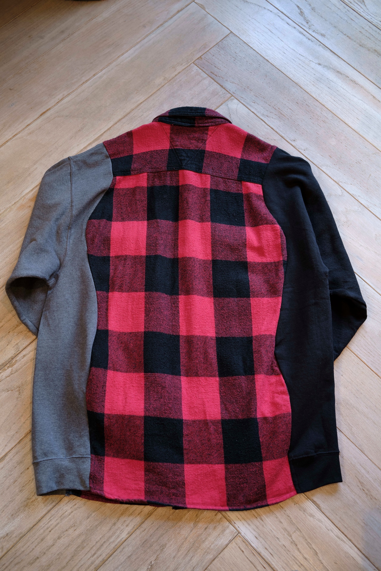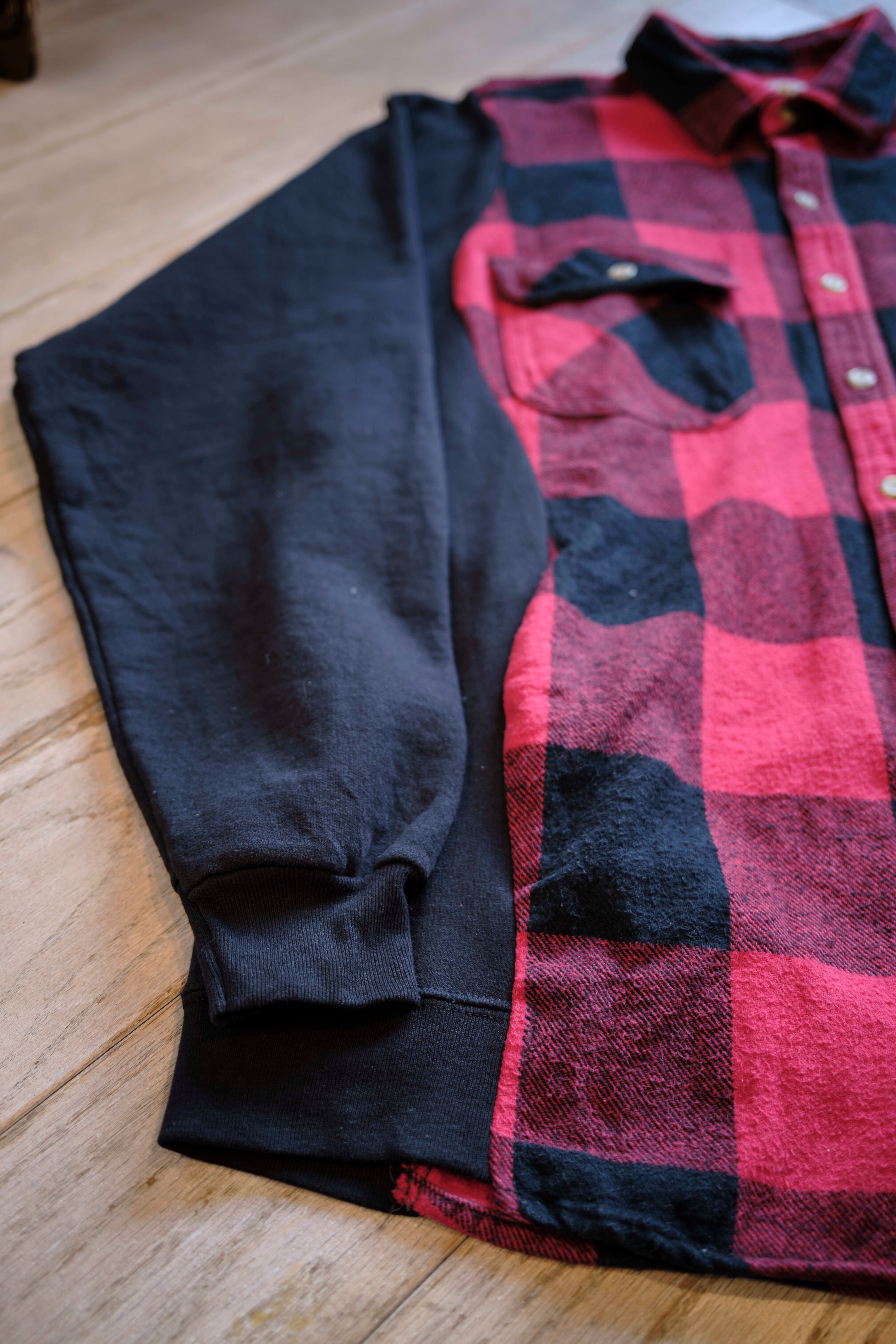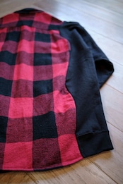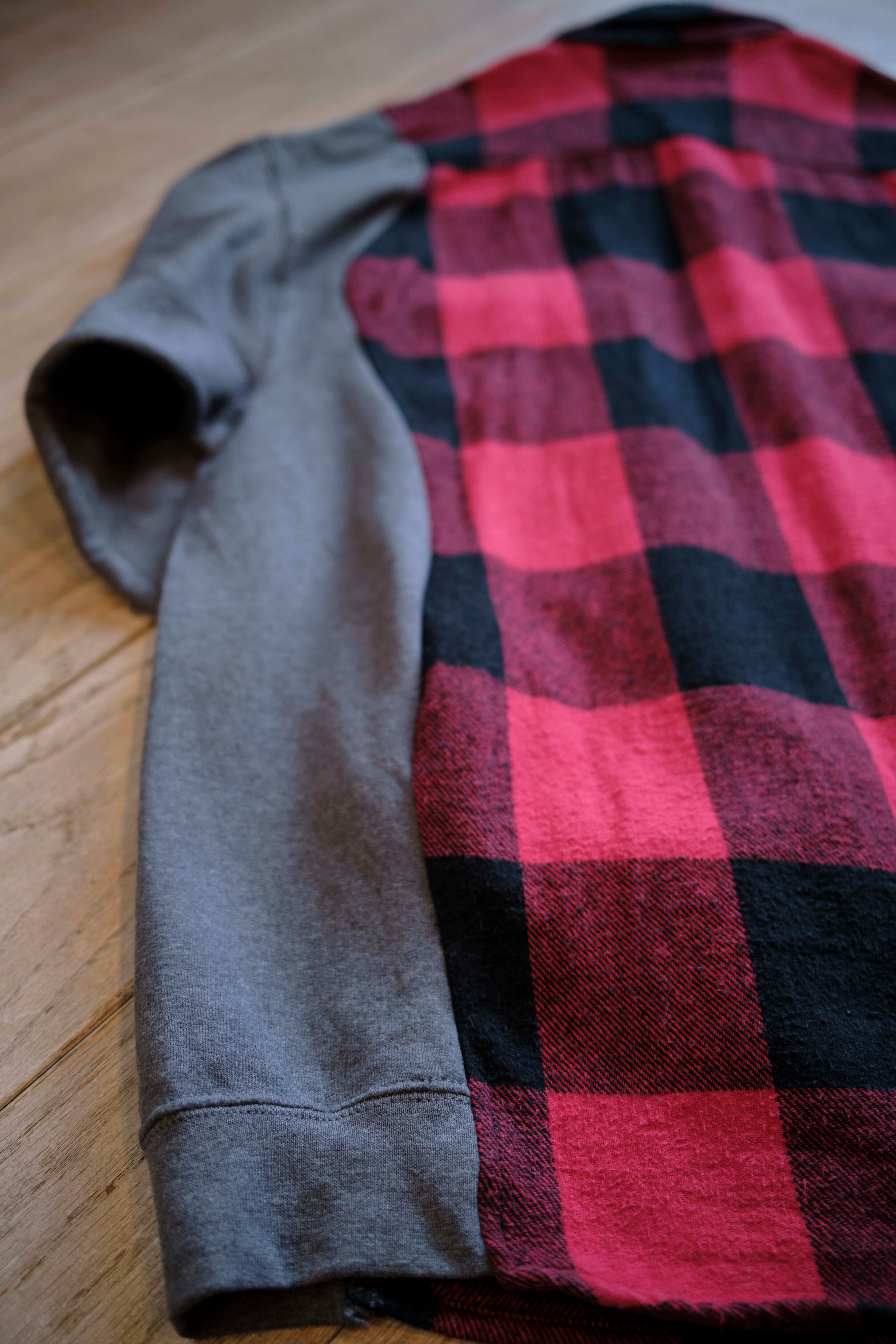 Ⅱ. 身頃は起毛感のあるコットンフランネル、袖は実際のスウェットを解体してドッキングされた左右色違いの裏毛生地で切り替えたアシンメトリーデザイン。特徴的なカッティングが、ヴィンテージながら現代的なモード感も併せ持たせている。