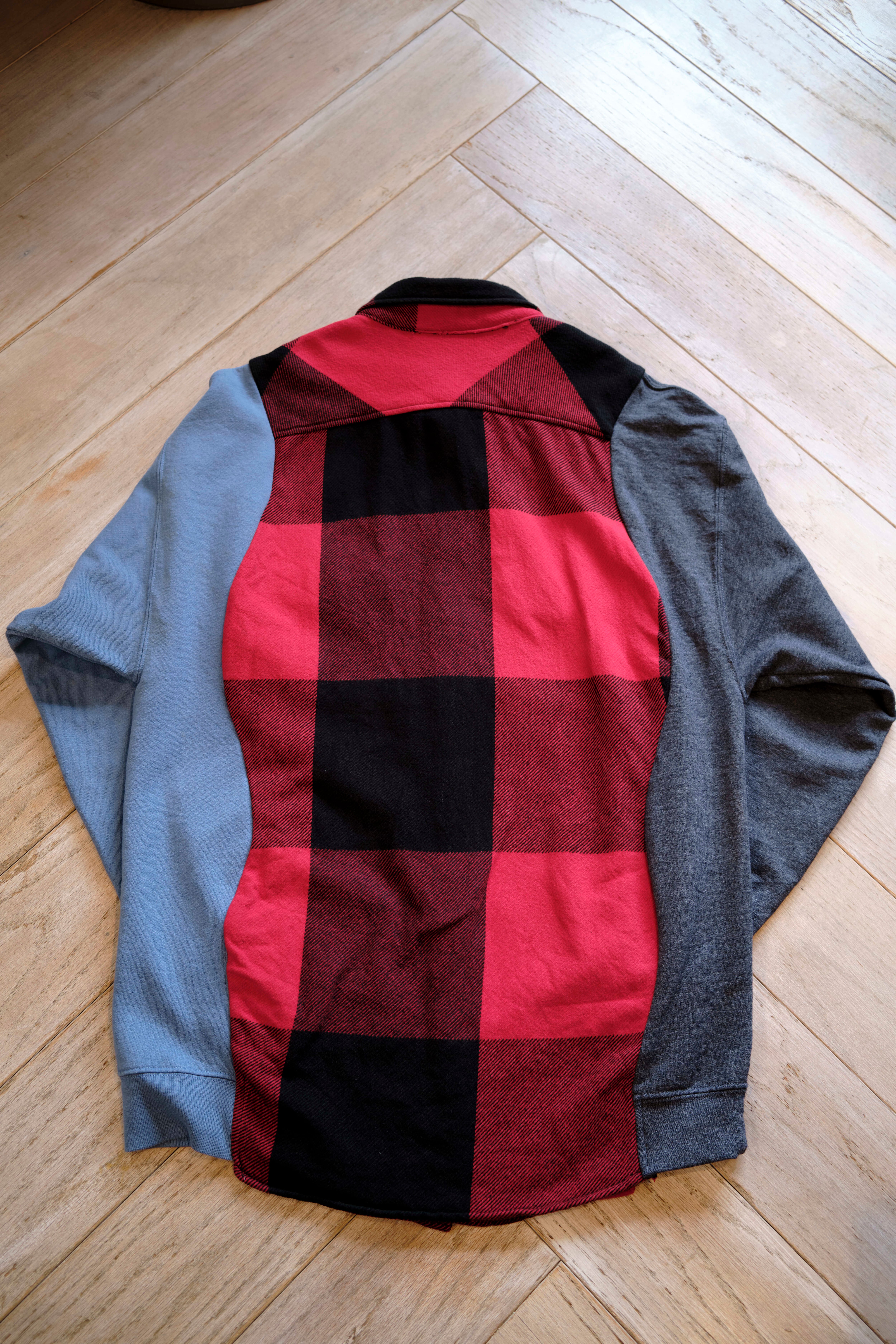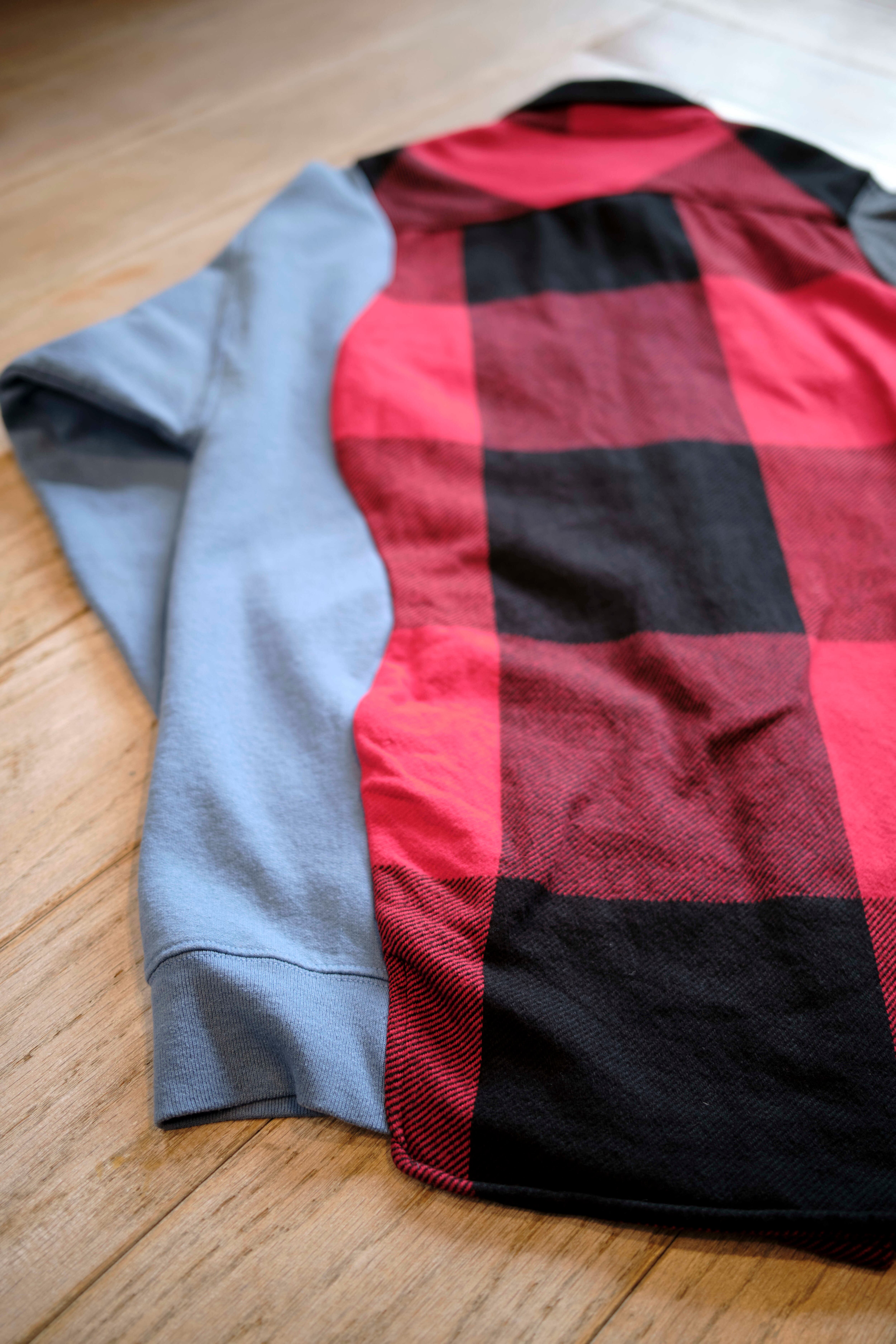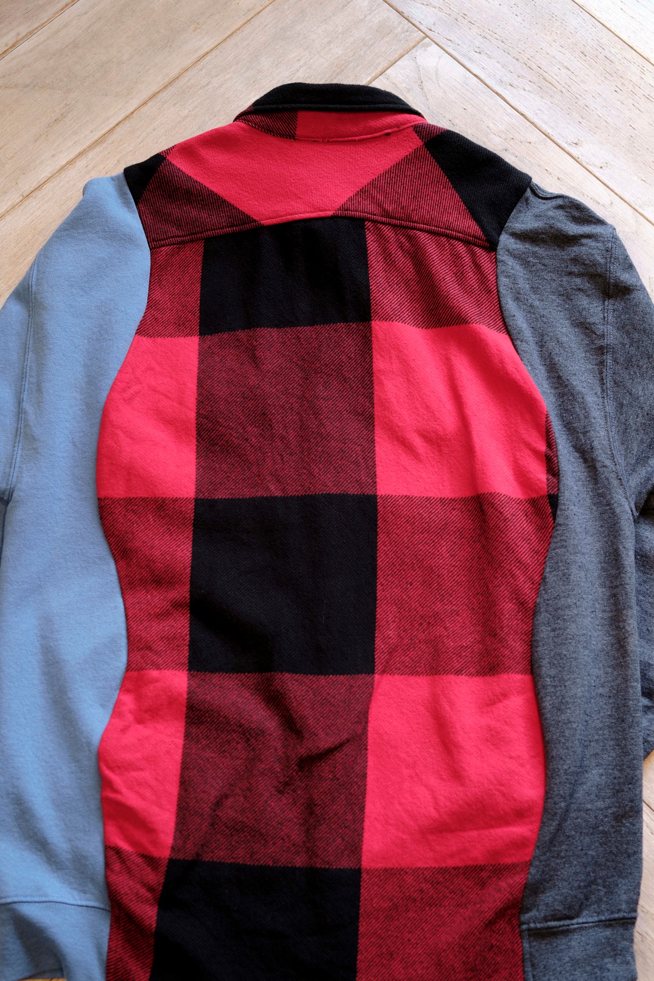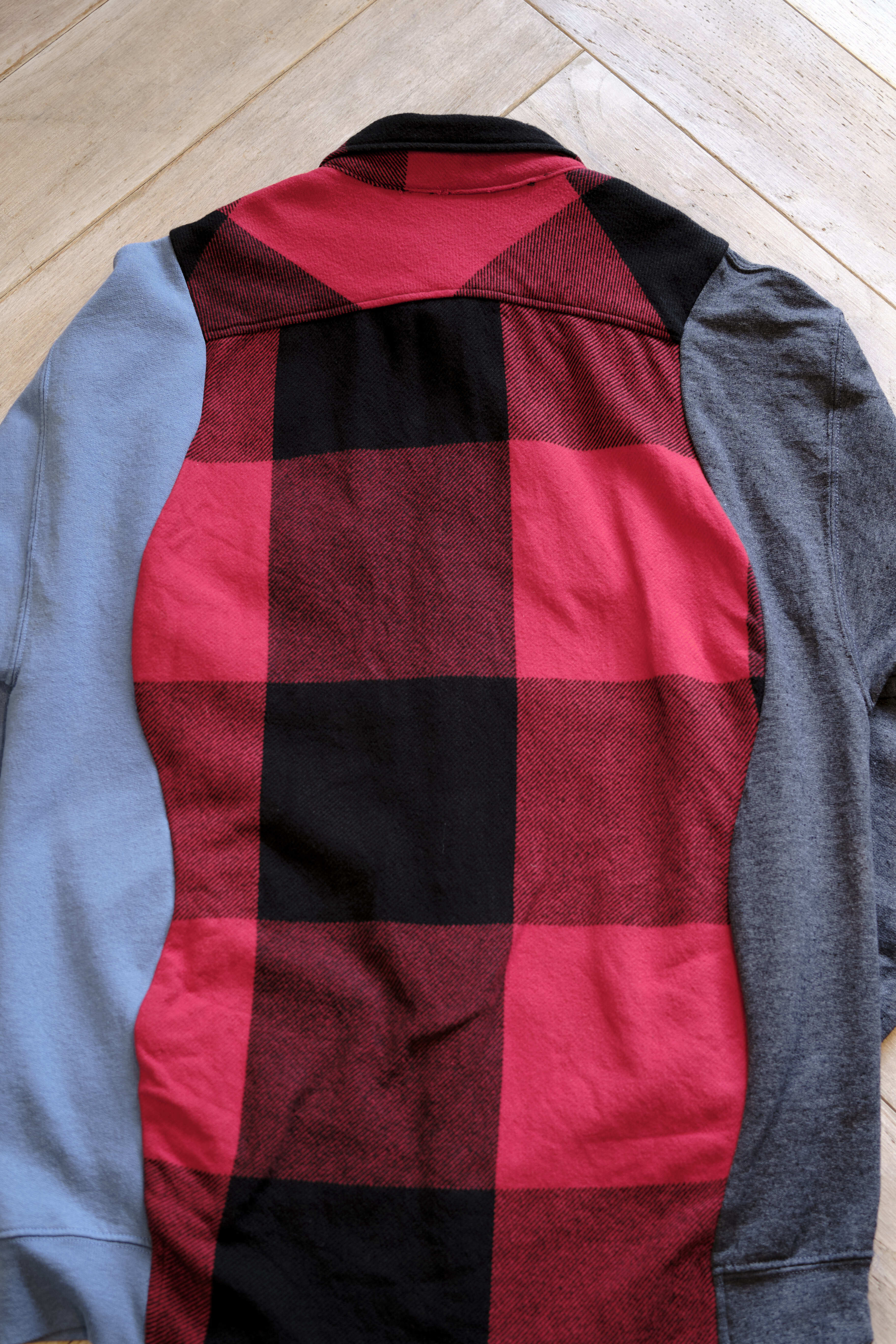 Ⅱ. 身頃は起毛感のあるコットンフランネル、袖は実際のスウェットを解体してドッキングされた左右色違いの裏毛生地で切り替えたアシンメトリーデザイン。特徴的なカッティングが、ヴィンテージながら現代的なモード感も併せ持たせている。