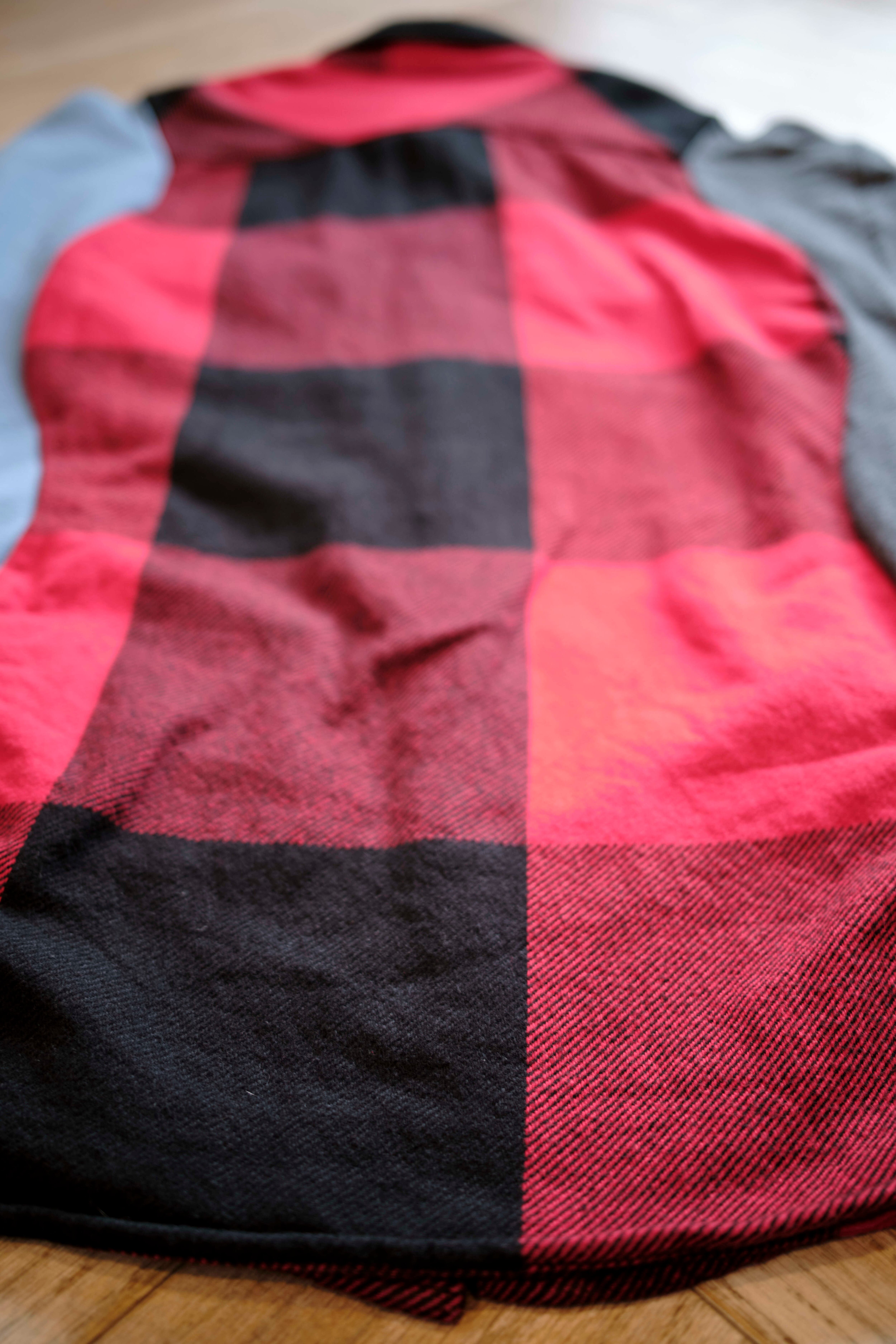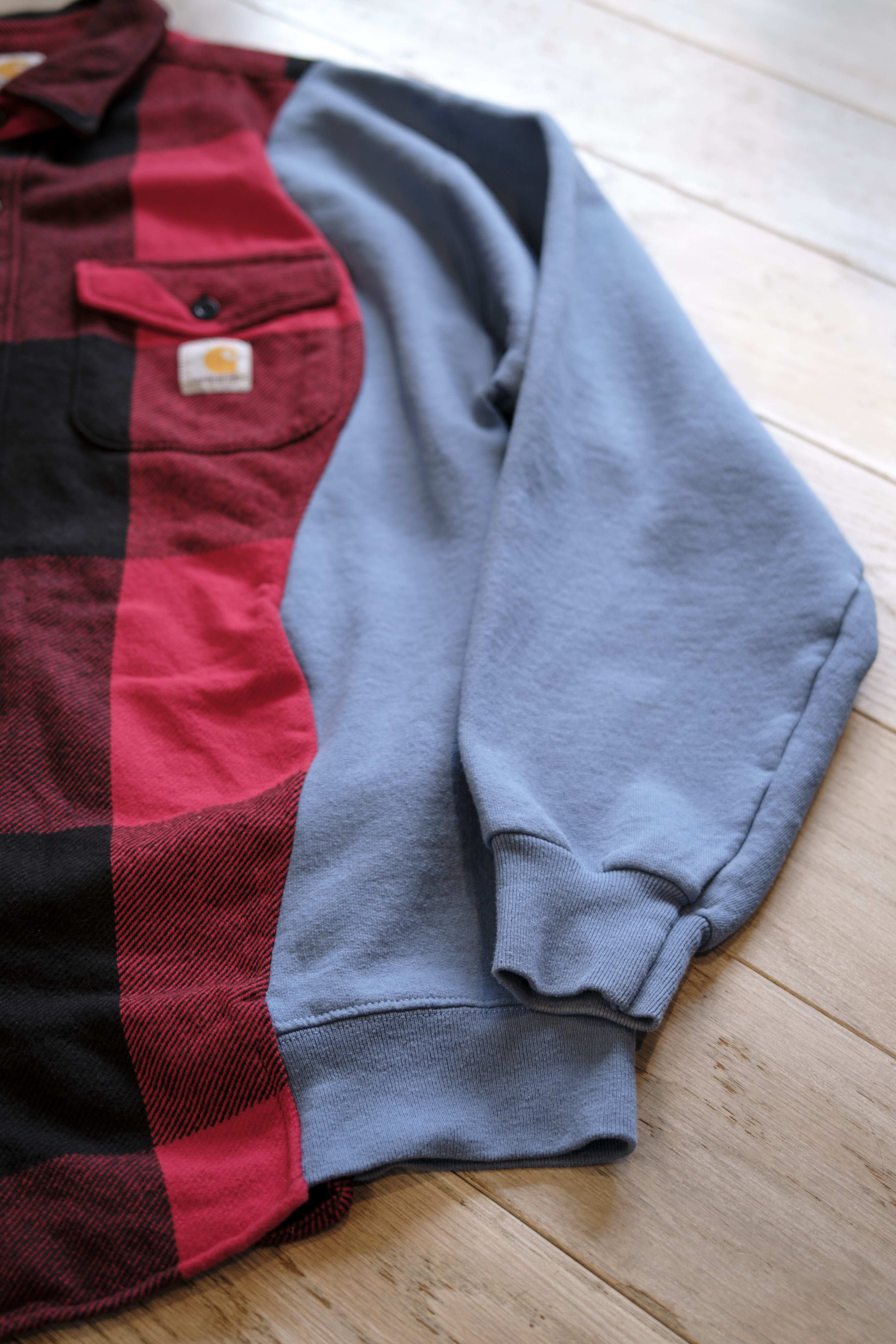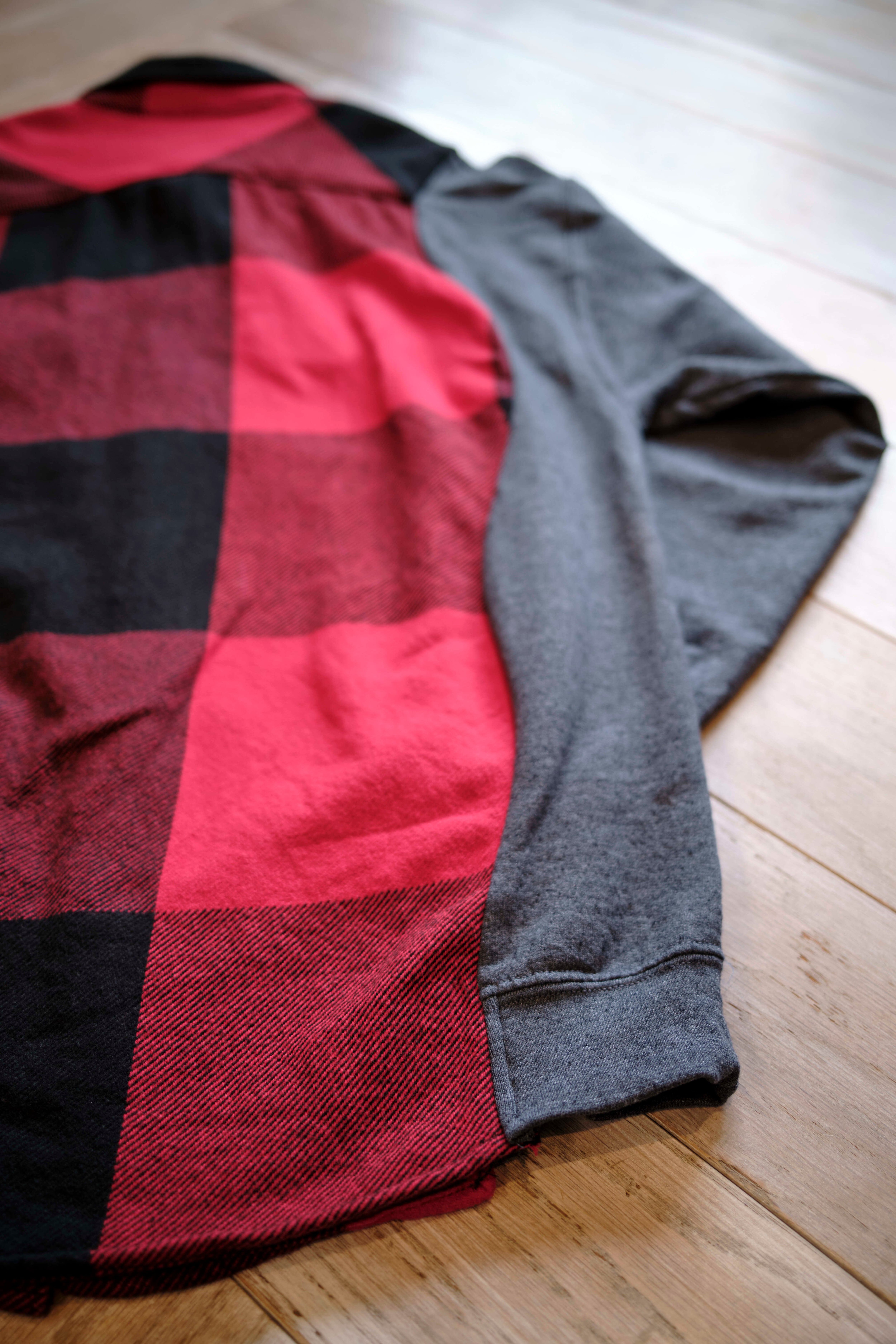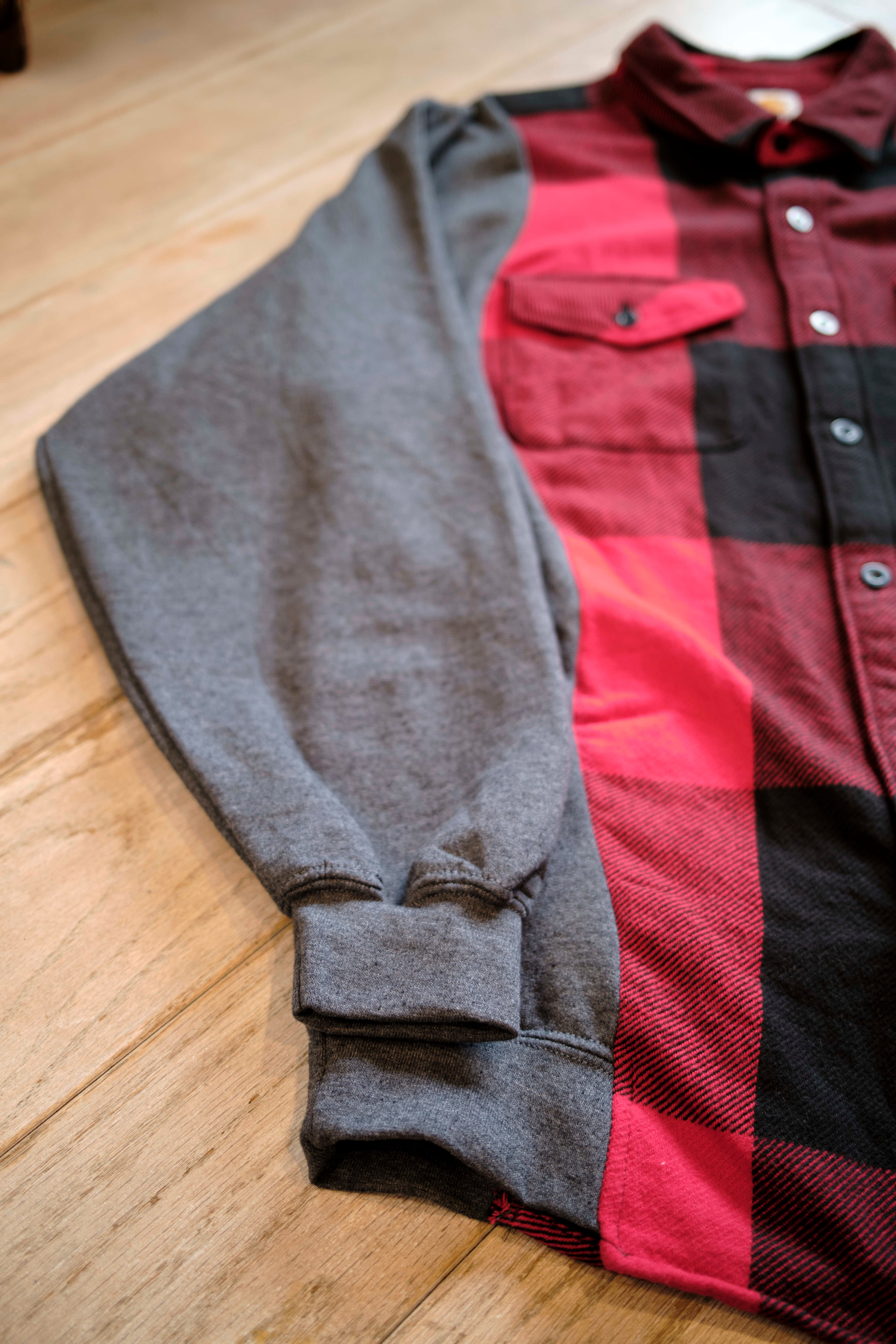 Ⅱ. 身頃は起毛感のあるコットンフランネル、袖は実際のスウェットを解体してドッキングされた左右色違いの裏毛生地で切り替えたアシンメトリーデザイン。特徴的なカッティングが、ヴィンテージながら現代的なモード感も併せ持たせている。