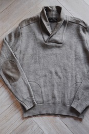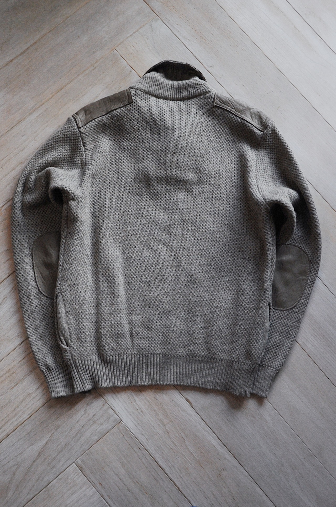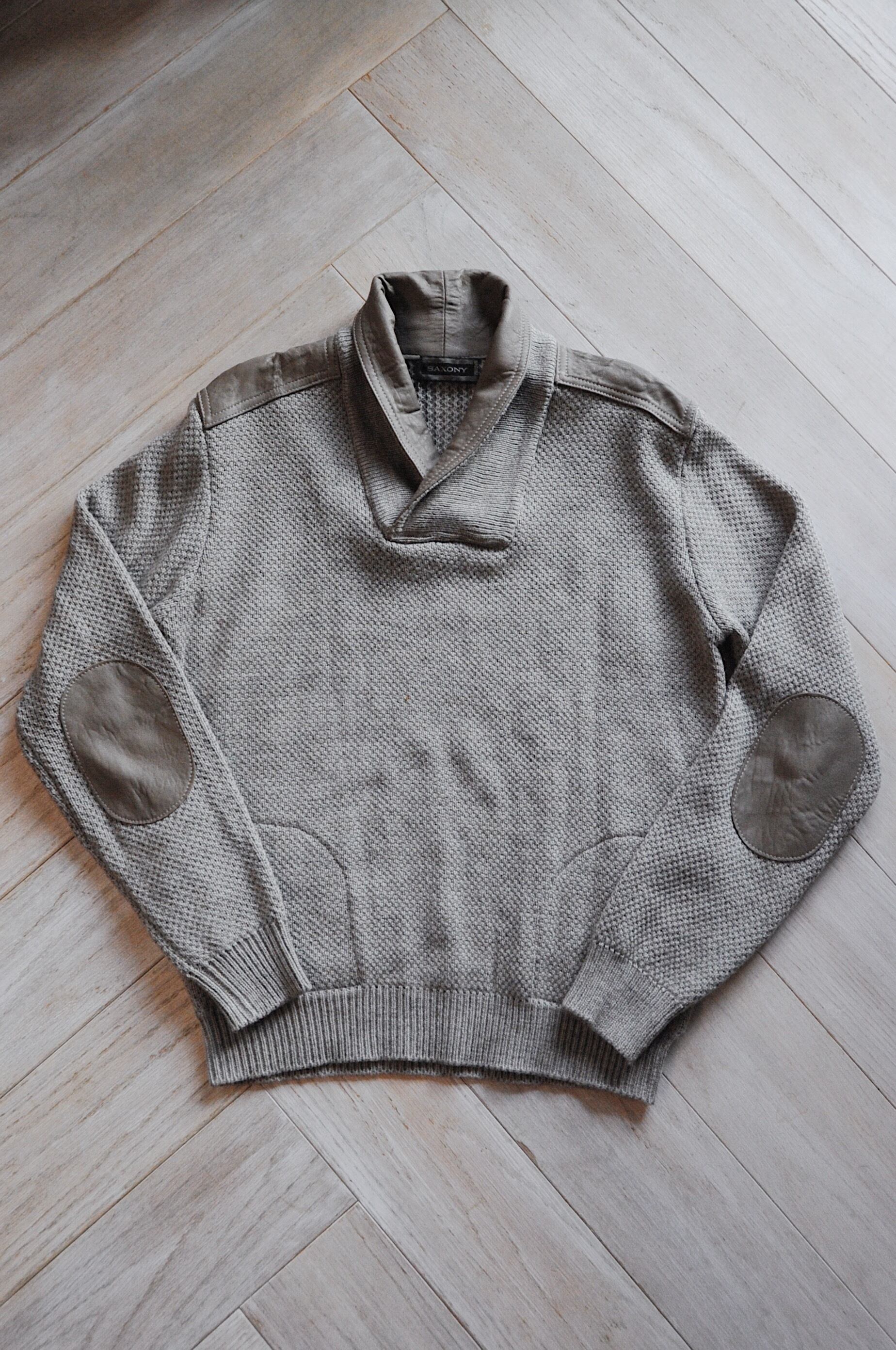 Ⅰ. ヴィンテージ感のある粗野なレザーがパッチワークされた、非常にデザイン性の高いニットセーター。