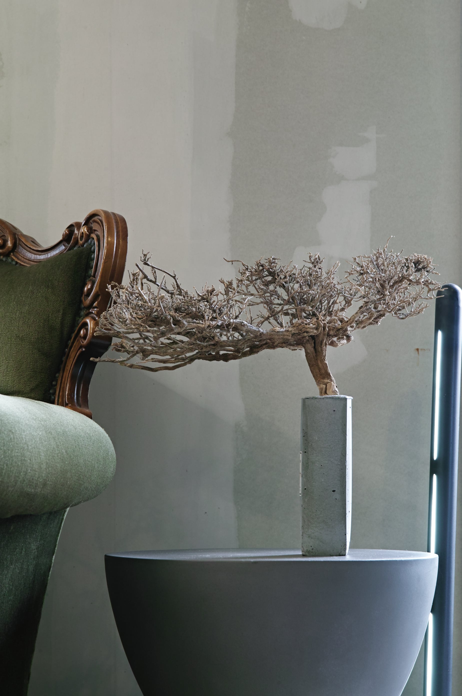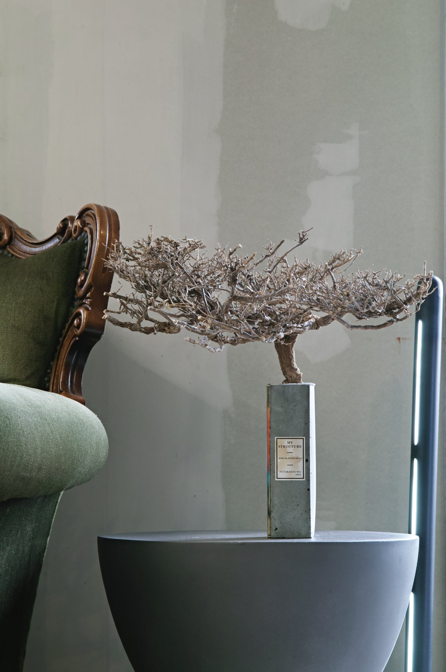 直線的なモルタルの無機的で冷たい質感と、自然が生み出した有機的な造形とのコントラスト。その境界線を隔てる金属。祈り、弔い、共存、自然と人工物との崇高な調和を表現。