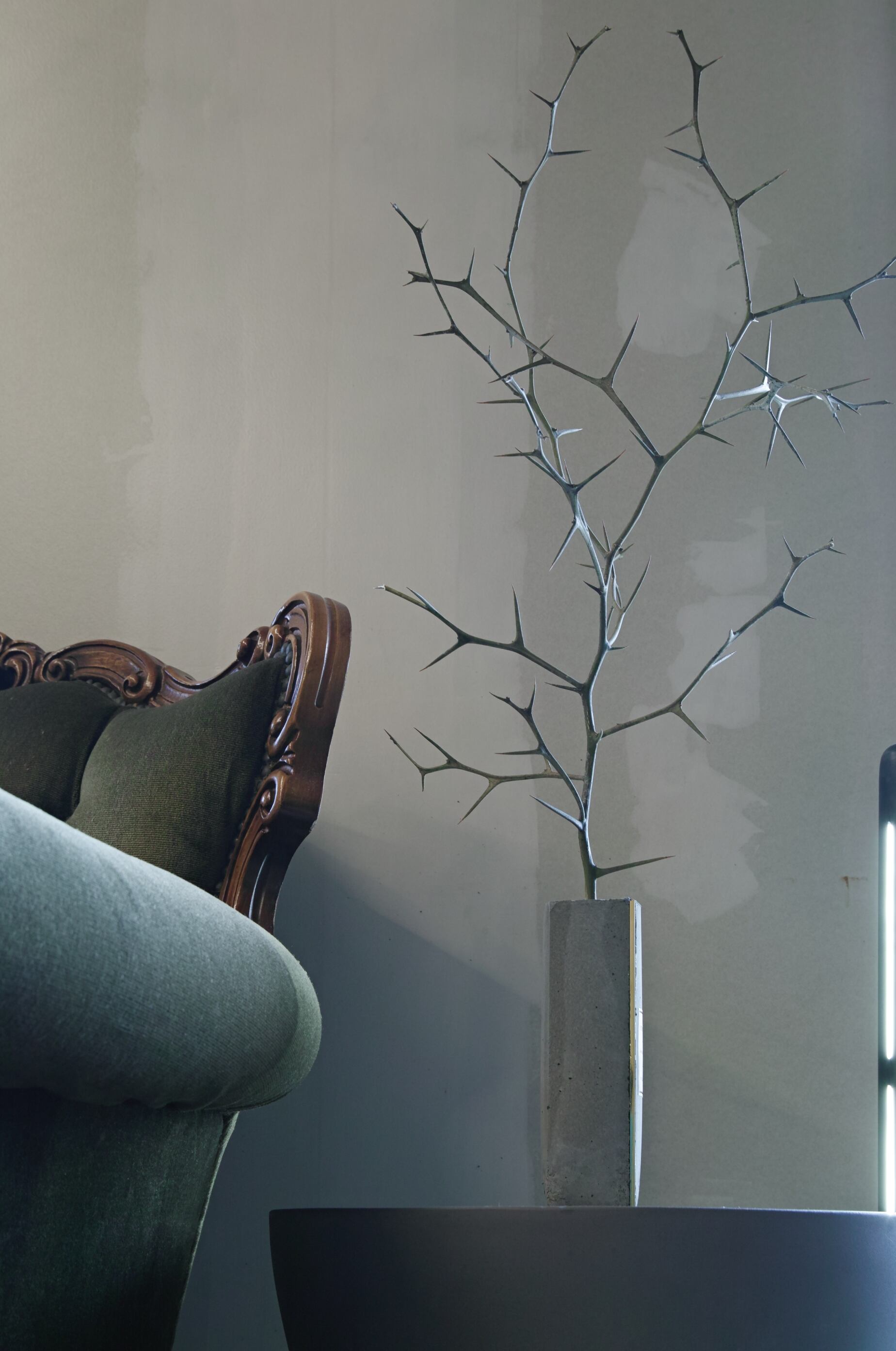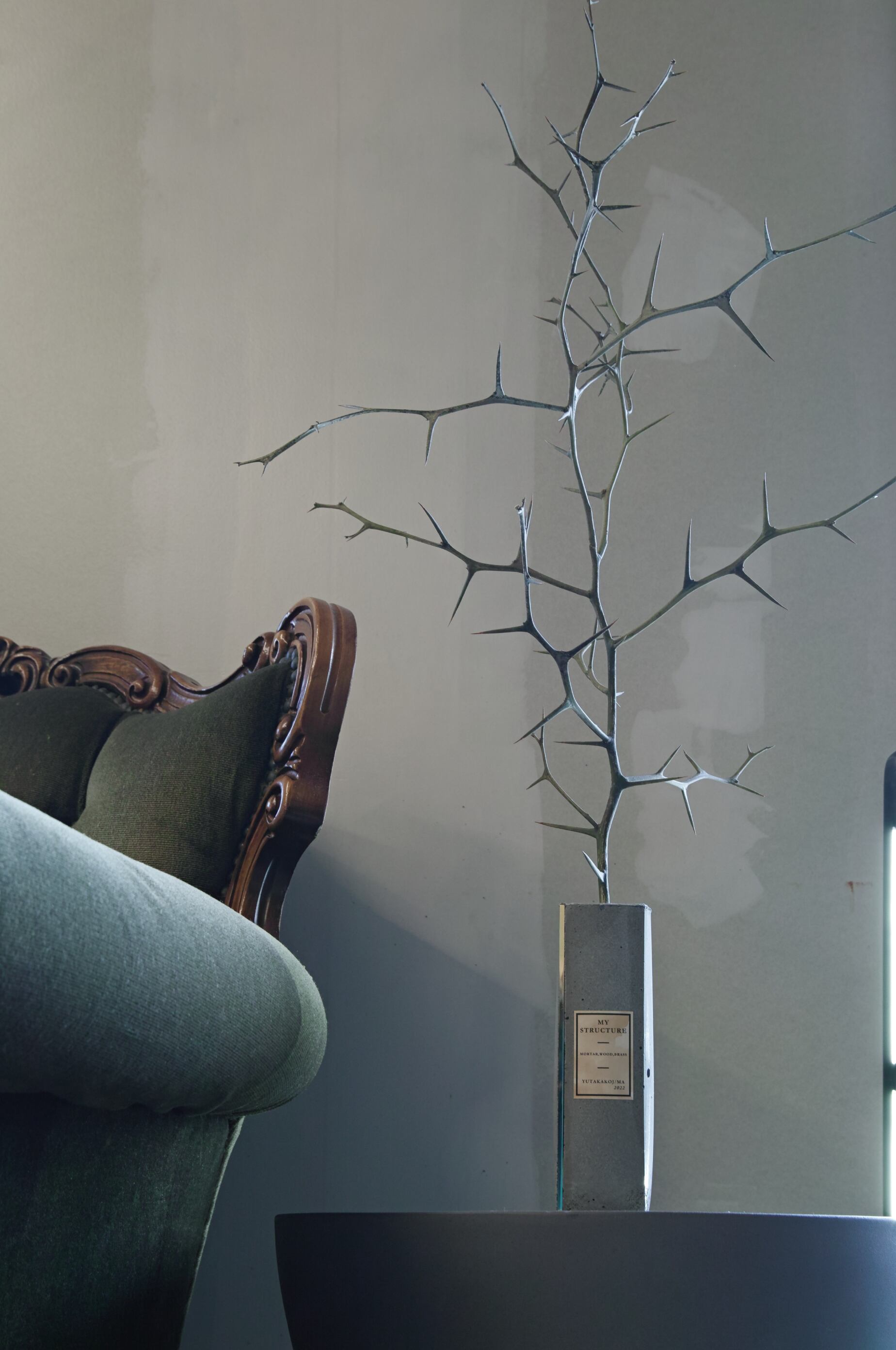 直線的なモルタルの無機的で冷たい質感と、自然が生み出した有機的な造形とのコントラスト。その境界線を隔てる金属。祈り、弔い、共存、自然と人工物との崇高な調和を表現。