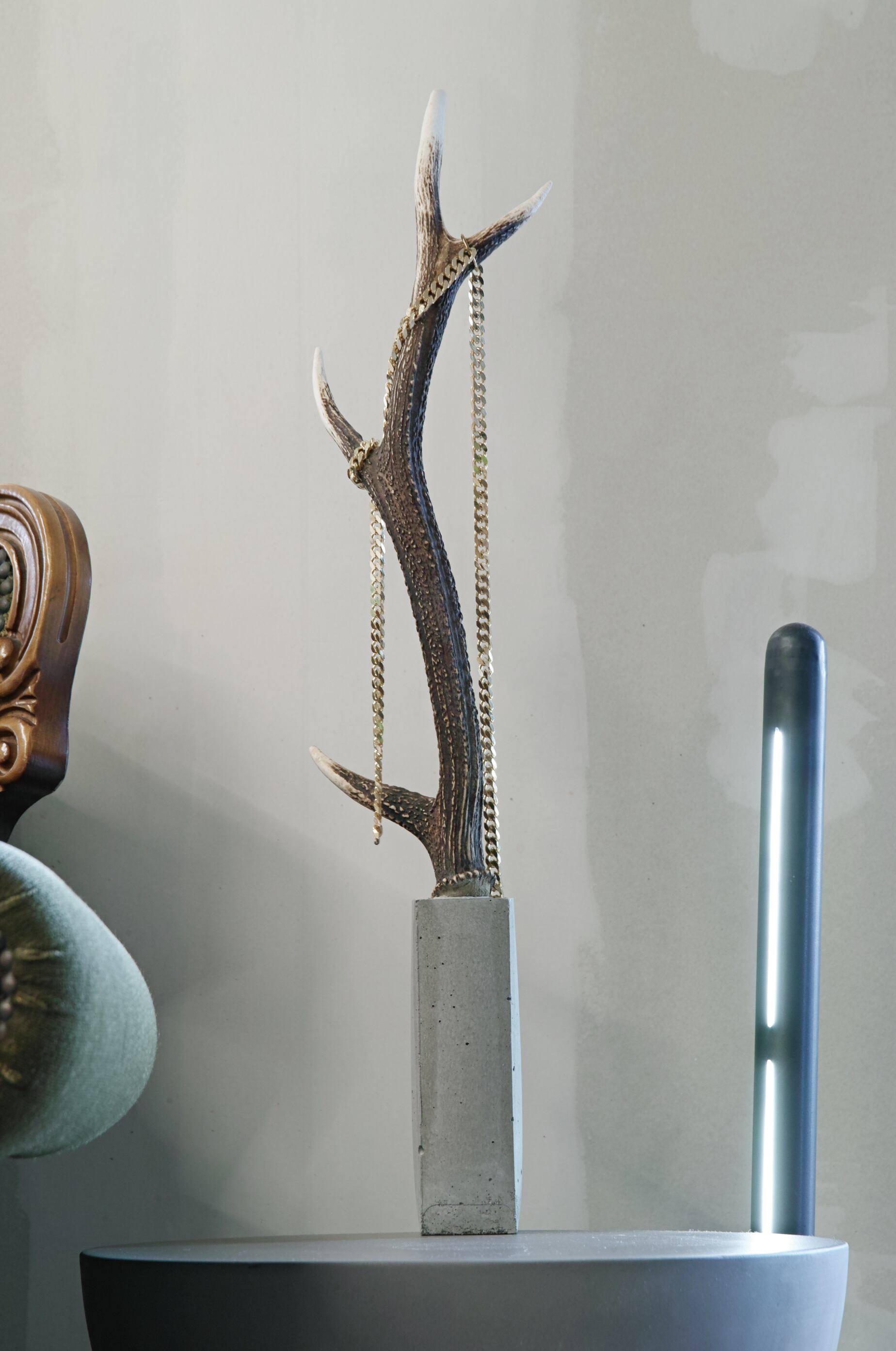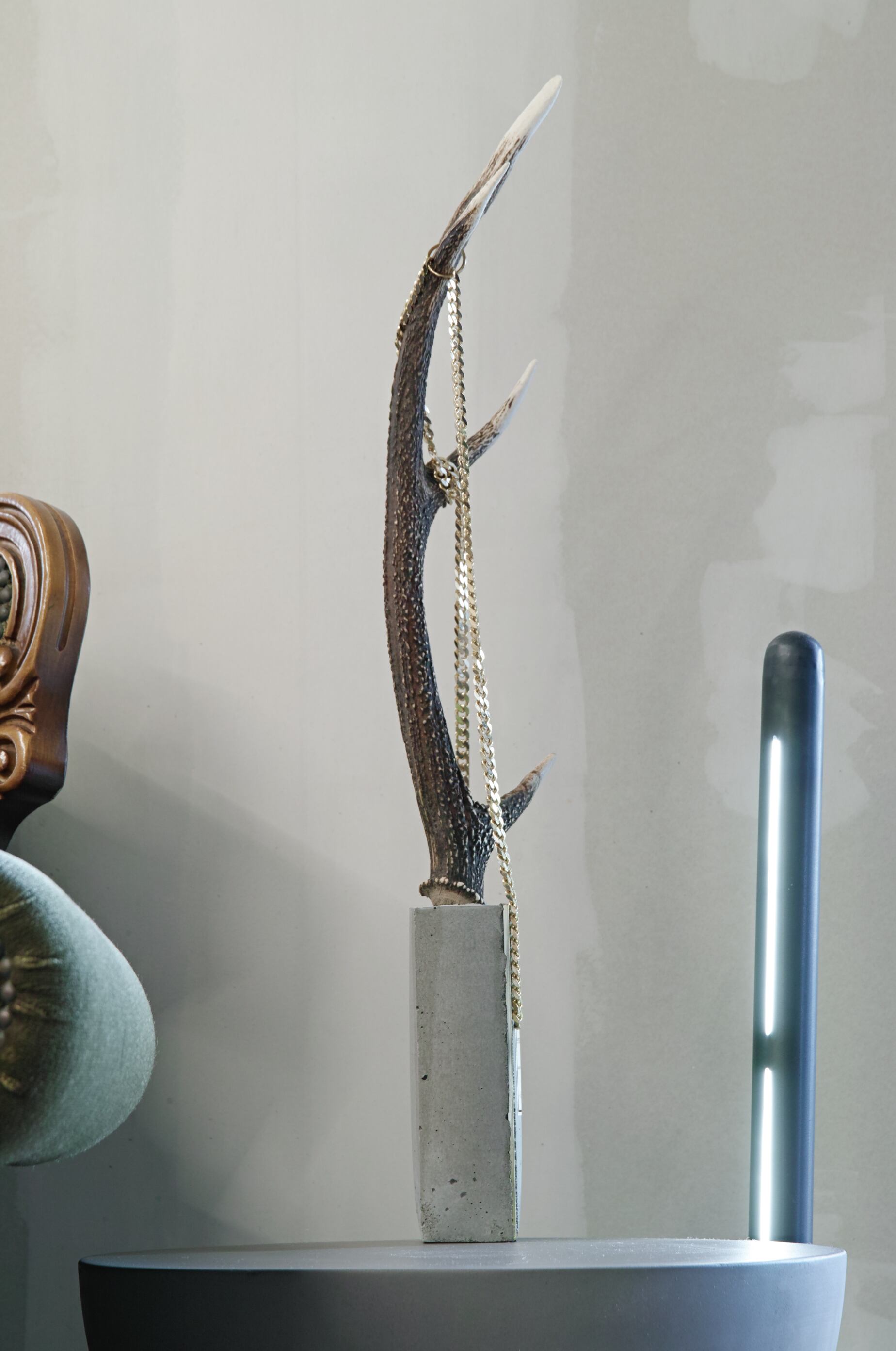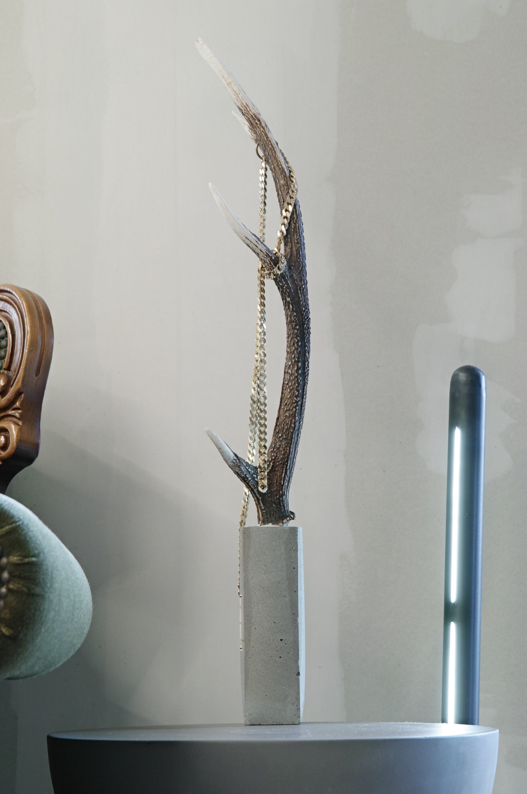 直線的なモルタルの無機的で冷たい質感と、自然が生み出した有機的な造形とのコントラスト。その境界線を隔てる金属。祈り、弔い、共存、自然と人工物との崇高な調和を表現。