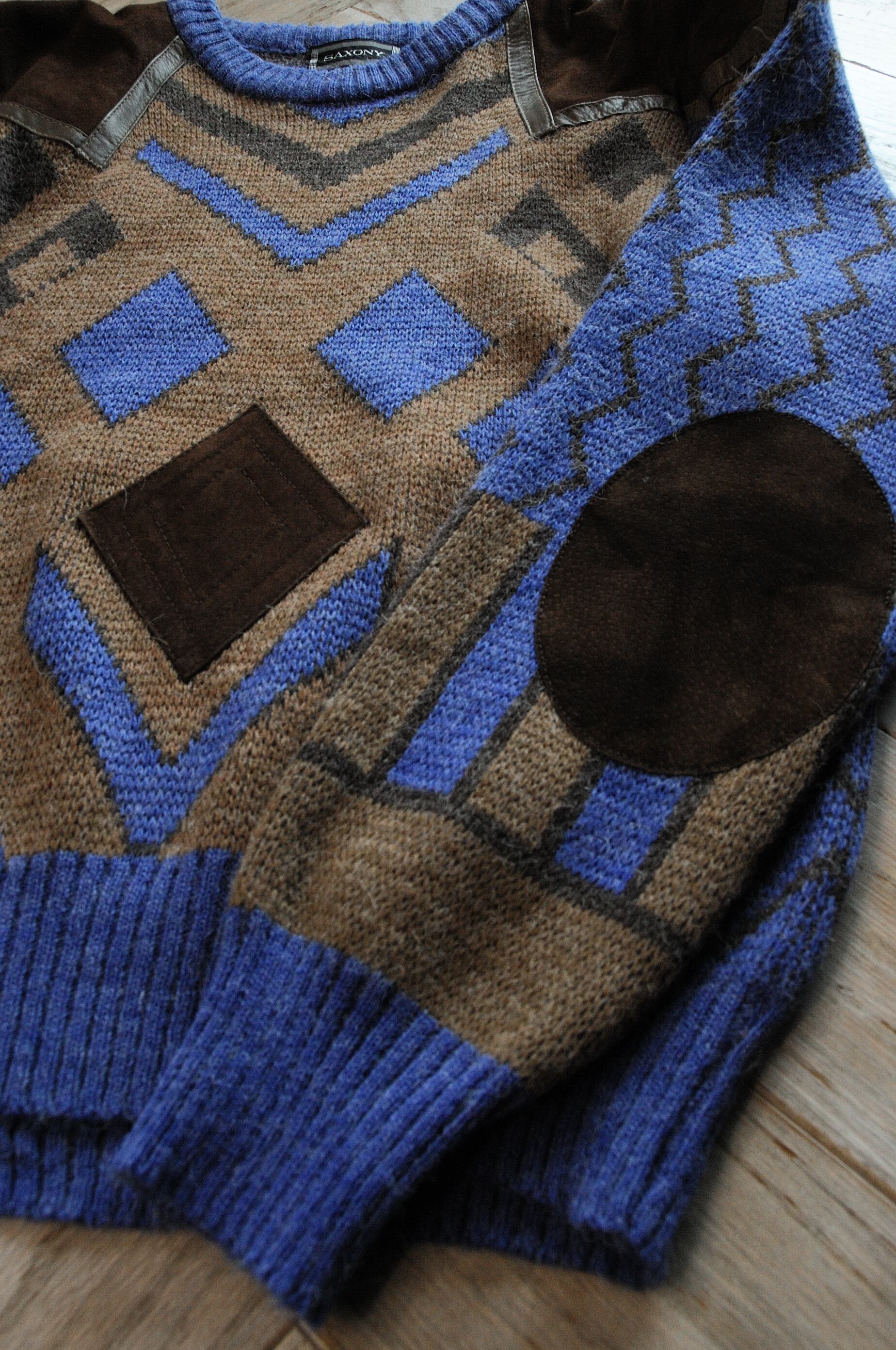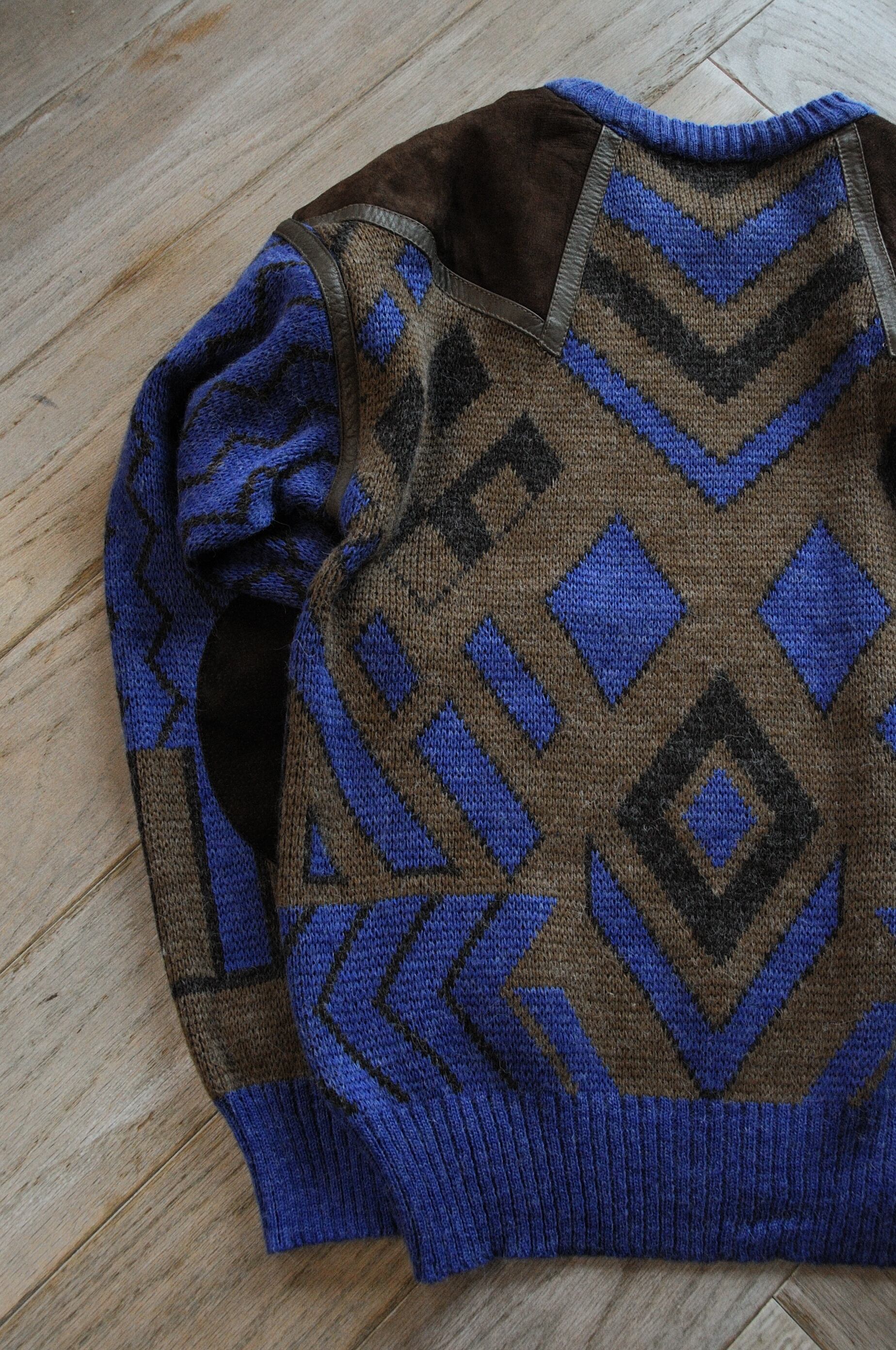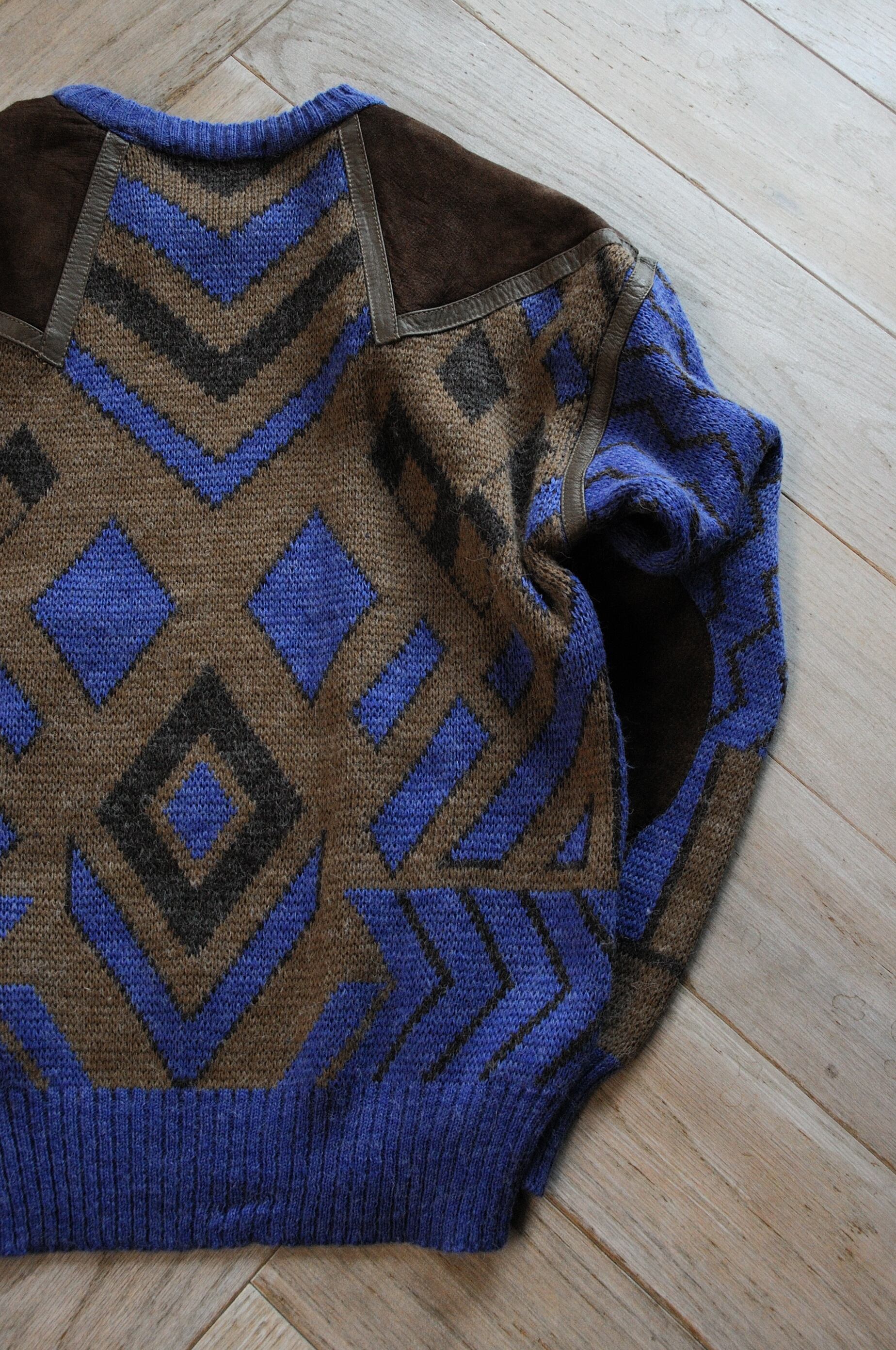 Ⅰ. ヴィンテージ感のある粗野なレザーがパッチワークされた、非常にデザイン性の高いニットセーター。