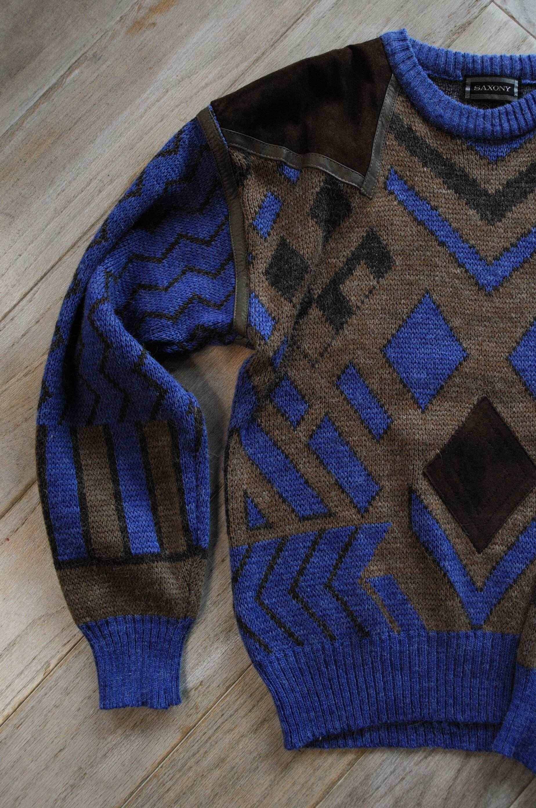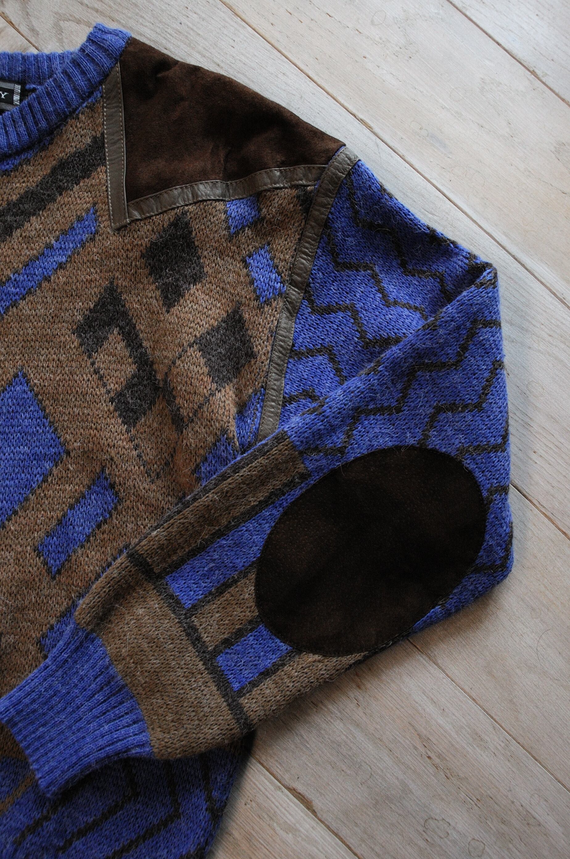 SAXONY ; PATCHWORKED LEATHER KNIT [BLU×BRN]