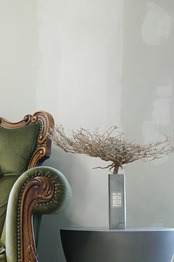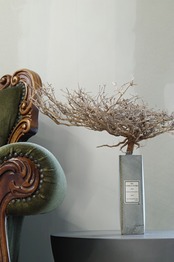 直線的なモルタルの無機的で冷たい質感と、自然が生み出した有機的な造形とのコントラスト。その境界線を隔てる金属。祈り、弔い、共存、自然と人工物との崇高な調和を表現。