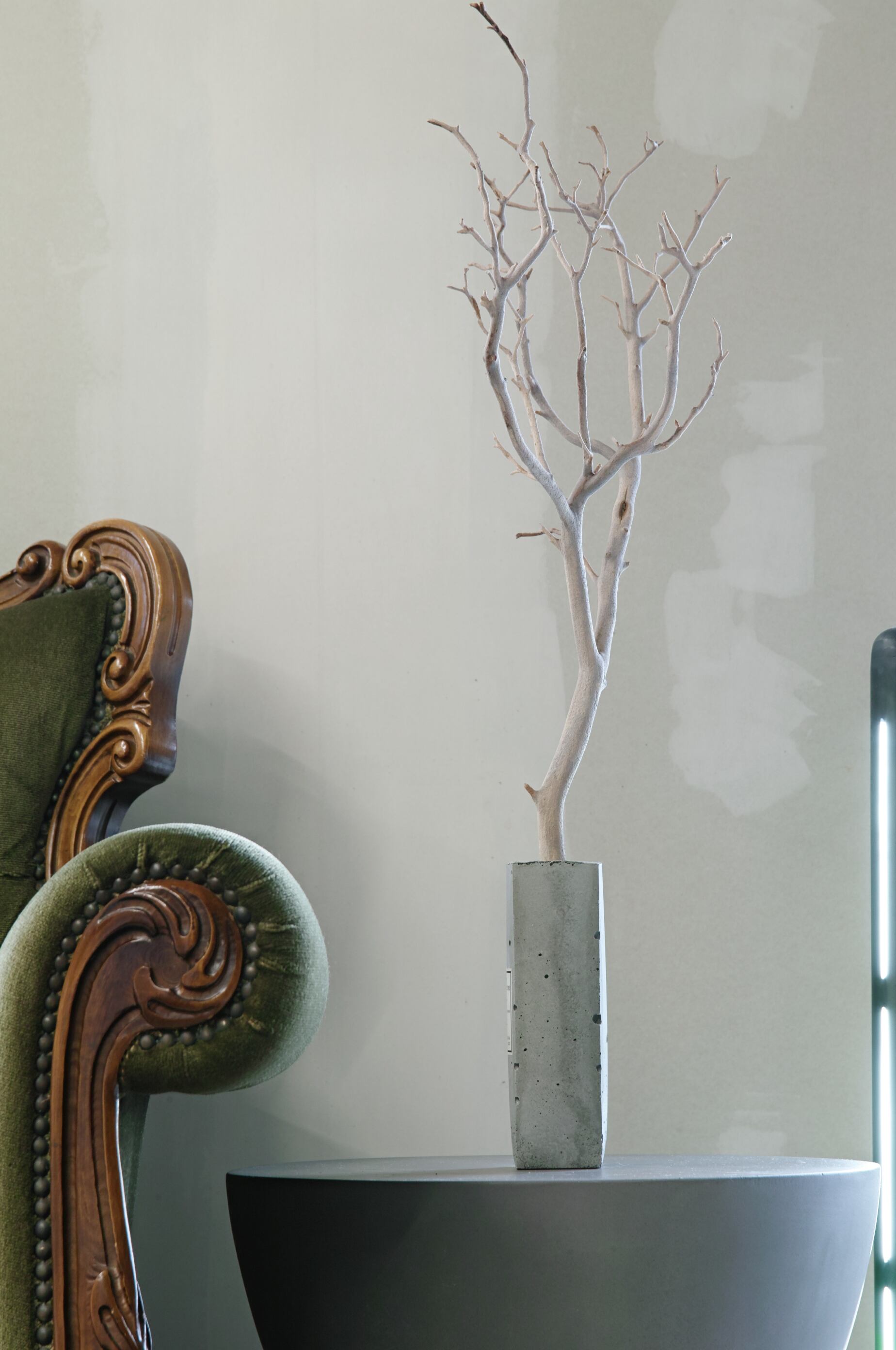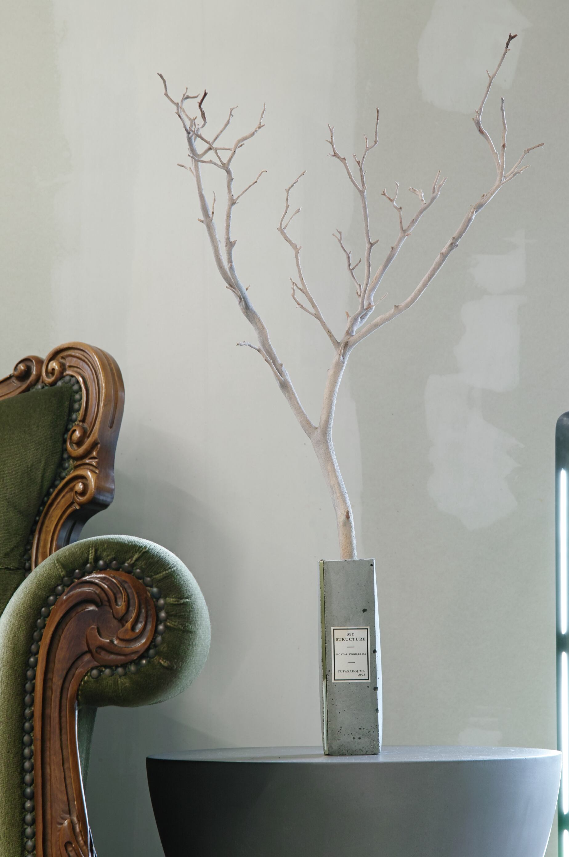 直線的なモルタルの無機的で冷たい質感と、自然が生み出した有機的な造形とのコントラスト。その境界線を隔てる金属。祈り、弔い、共存、自然と人工物との崇高な調和を表現。