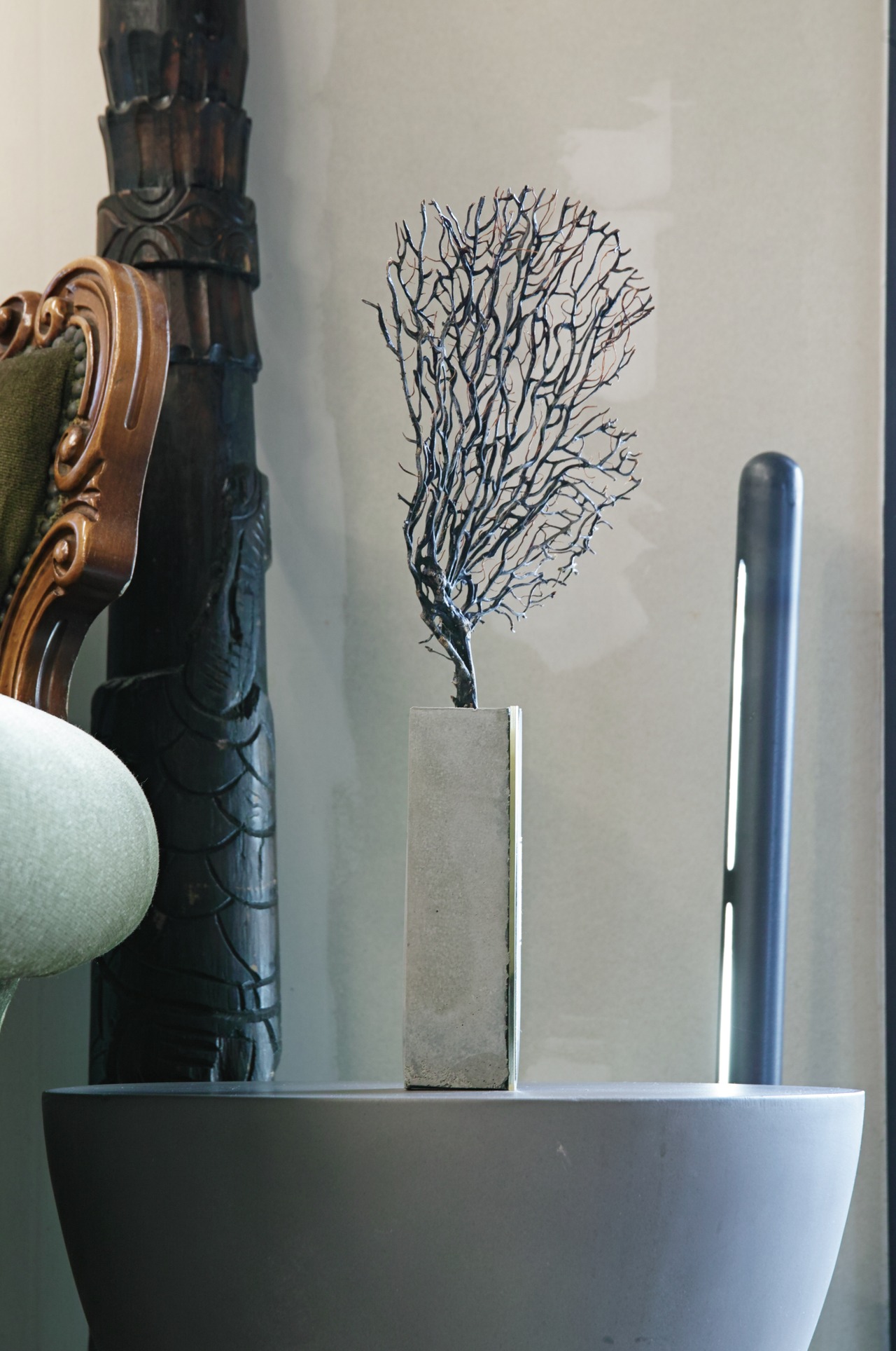 直線的なモルタルの無機的で冷たい質感と、自然が生み出した有機的な造形とのコントラスト。その境界線を隔てる金属。祈り、弔い、共存、自然と人工物との崇高な調和を表現。