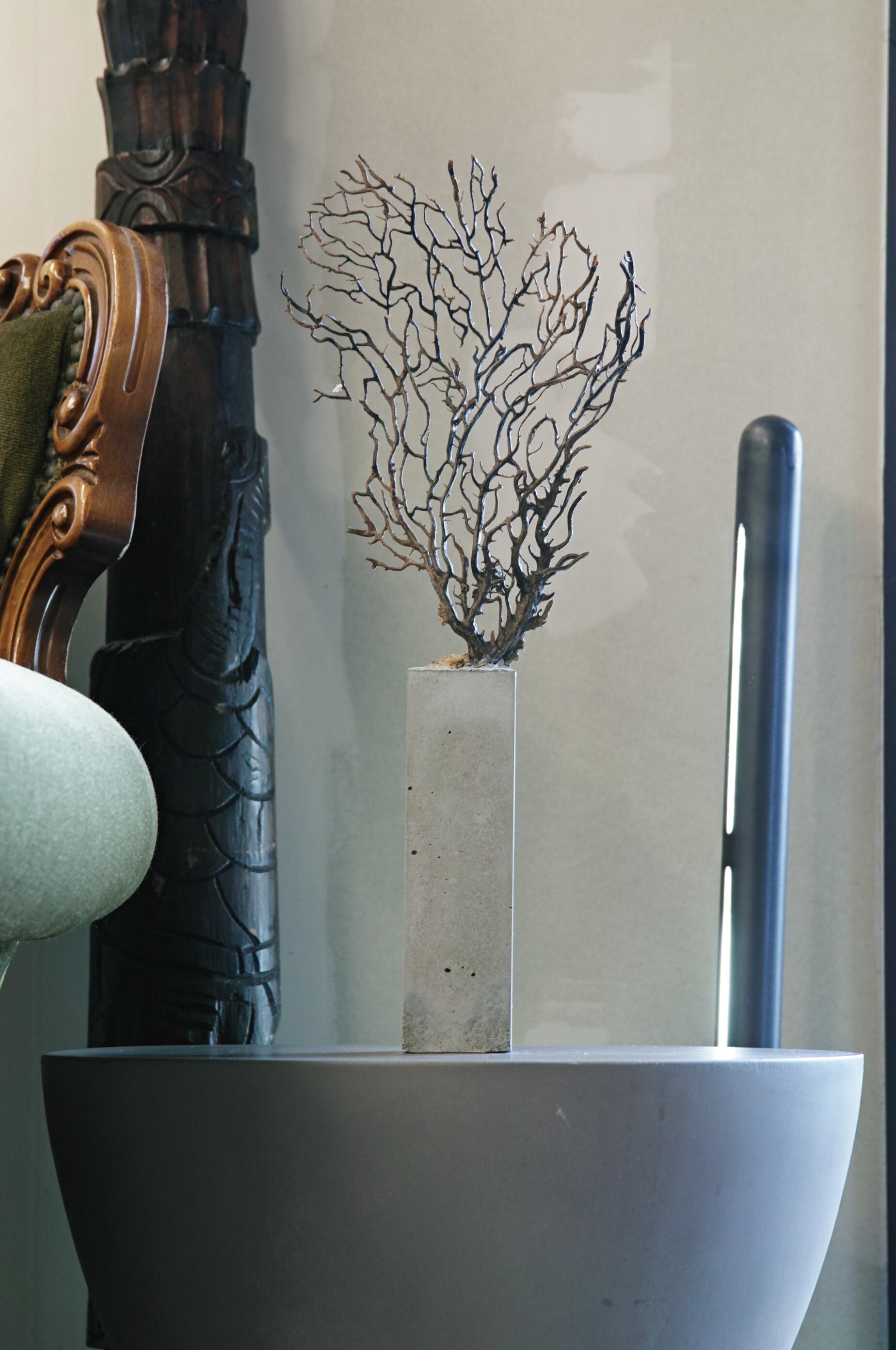 直線的なモルタルの無機的で冷たい質感と、自然が生み出した有機的な造形とのコントラスト。その境界線を隔てる金属。祈り、弔い、共存、自然と人工物との崇高な調和を表現。
