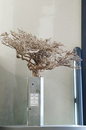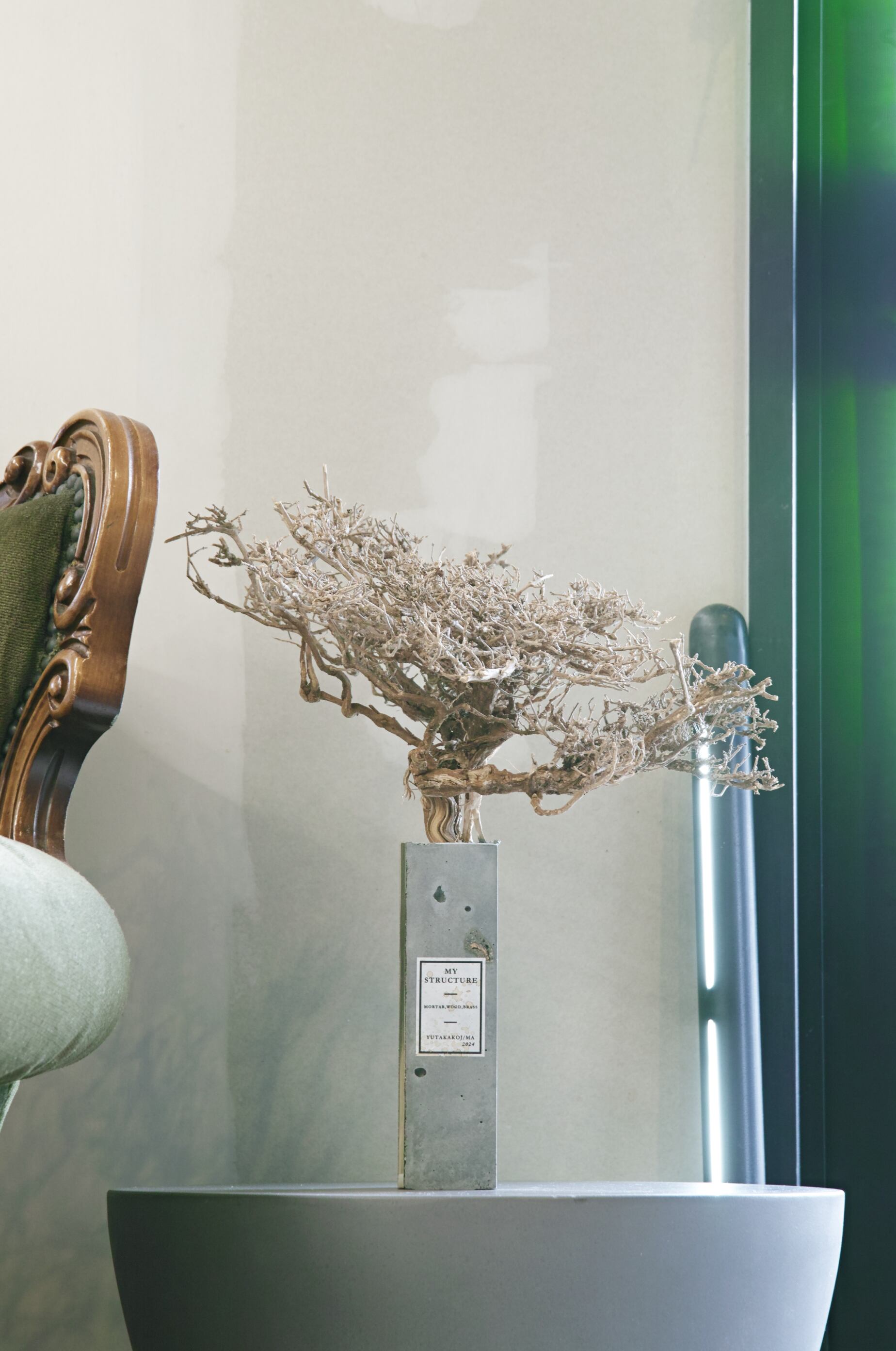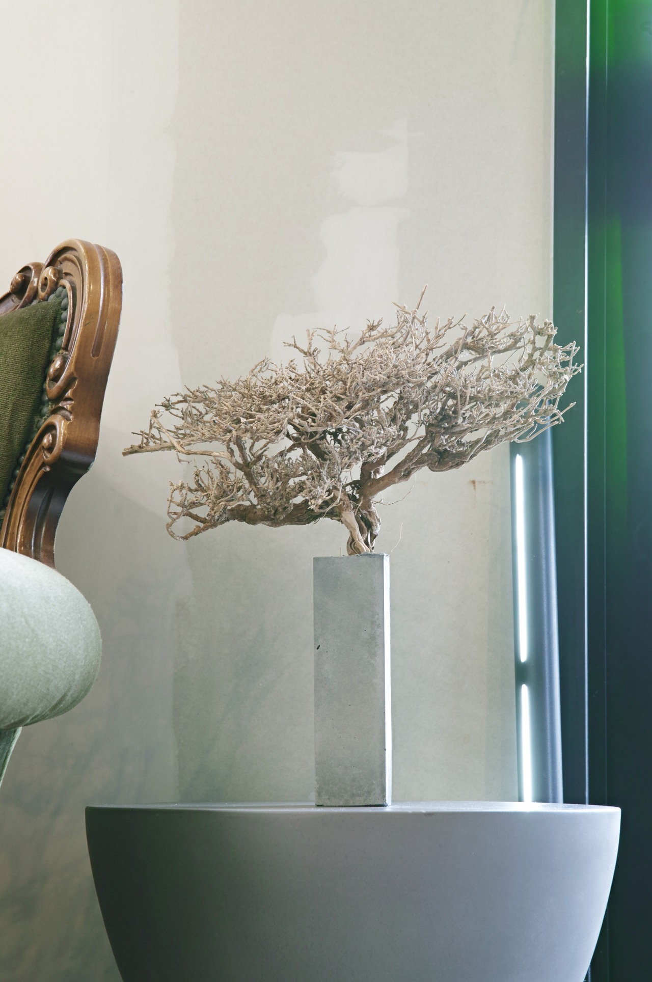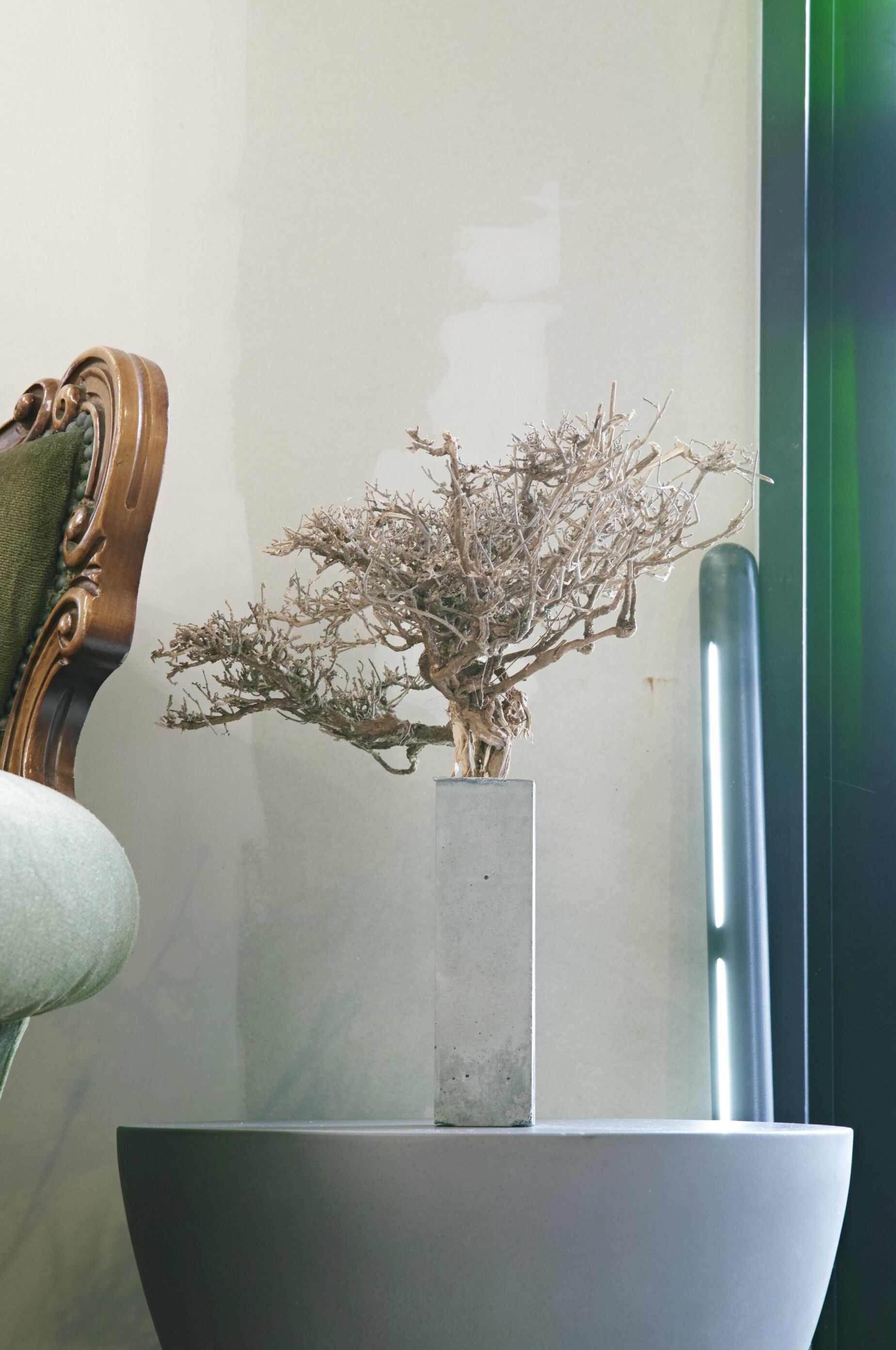 直線的なモルタルの無機的で冷たい質感と、自然が生み出した有機的な造形とのコントラスト。その境界線を隔てる金属。祈り、弔い、共存、自然と人工物との崇高な調和を表現。