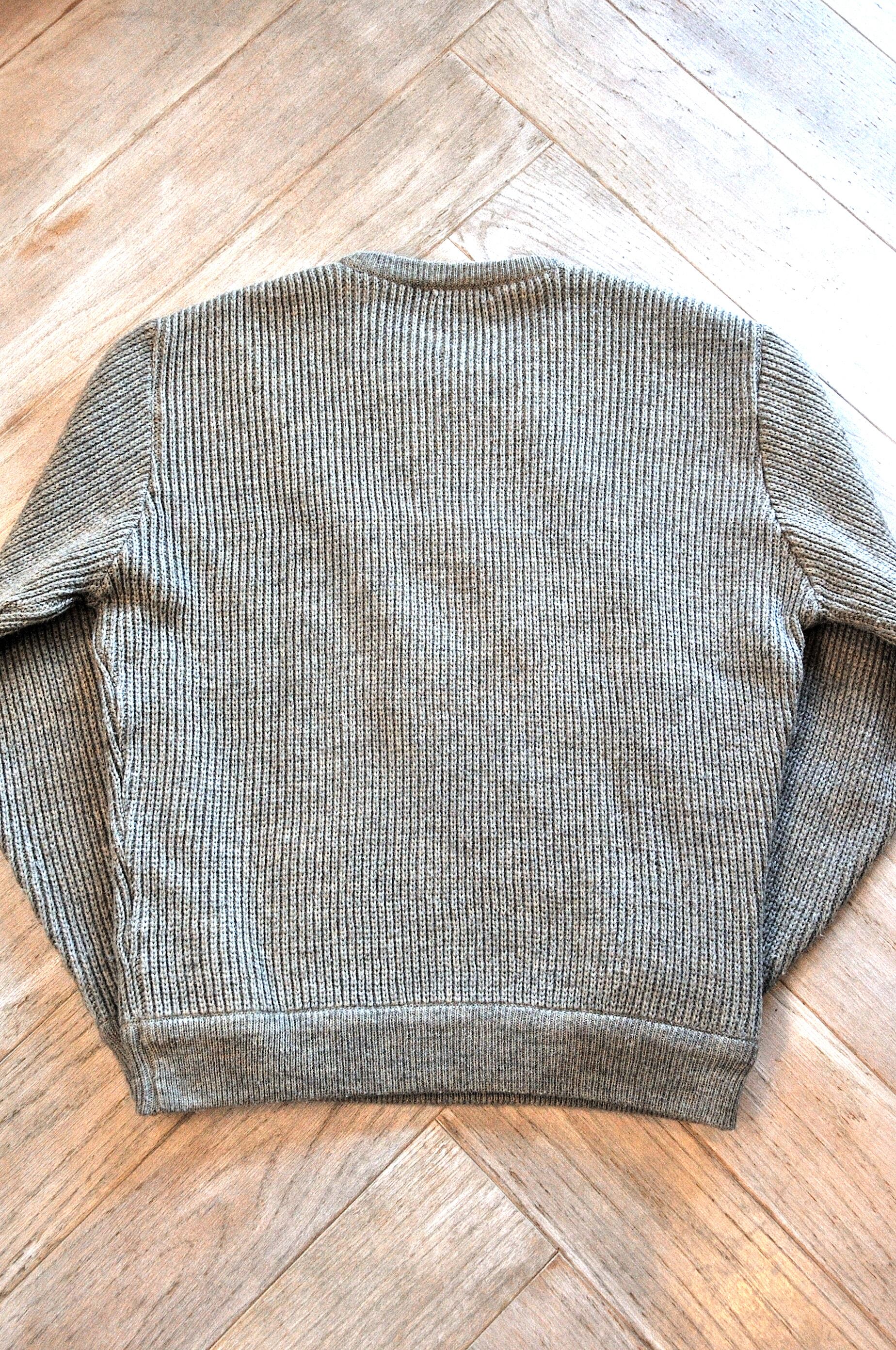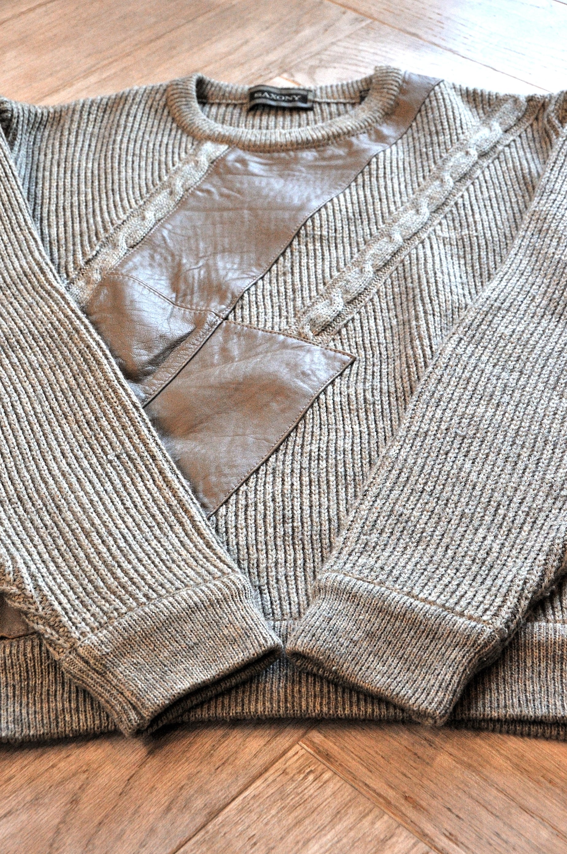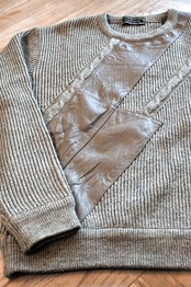 Ⅰ. ヴィンテージ感のある粗野なレザーがパッチワークされた、非常にデザイン性の高いニットセーター。